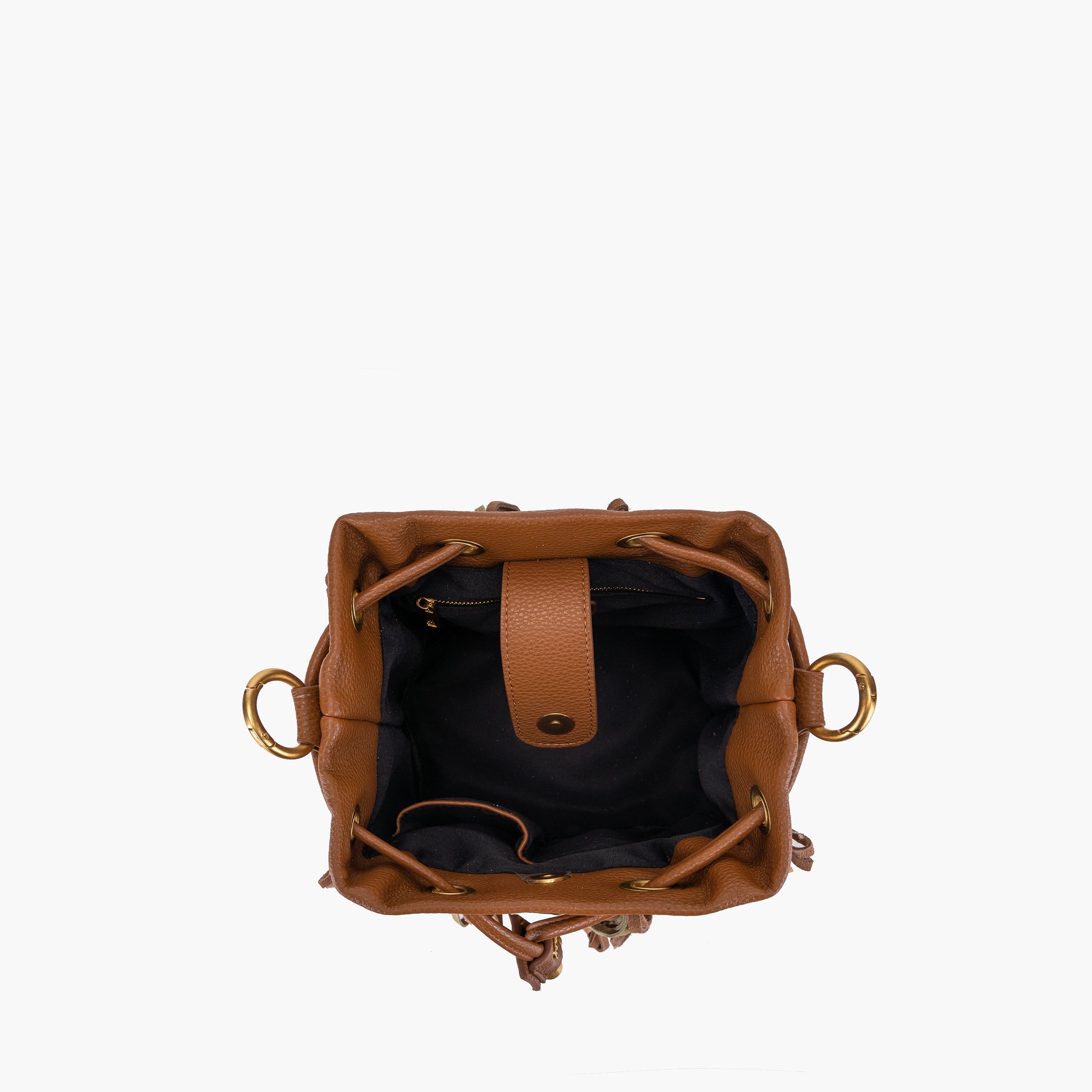Bolsa La Carrie Secchiello Cavallino & Franjas (Ref. 152M-EM-302-MIS_CO-CI) – Um bucket bag ousado em cavallino com eco-pele martelada, enriquecido por franjas em camurça que lhe conferem movimento e estilo boho-chic.