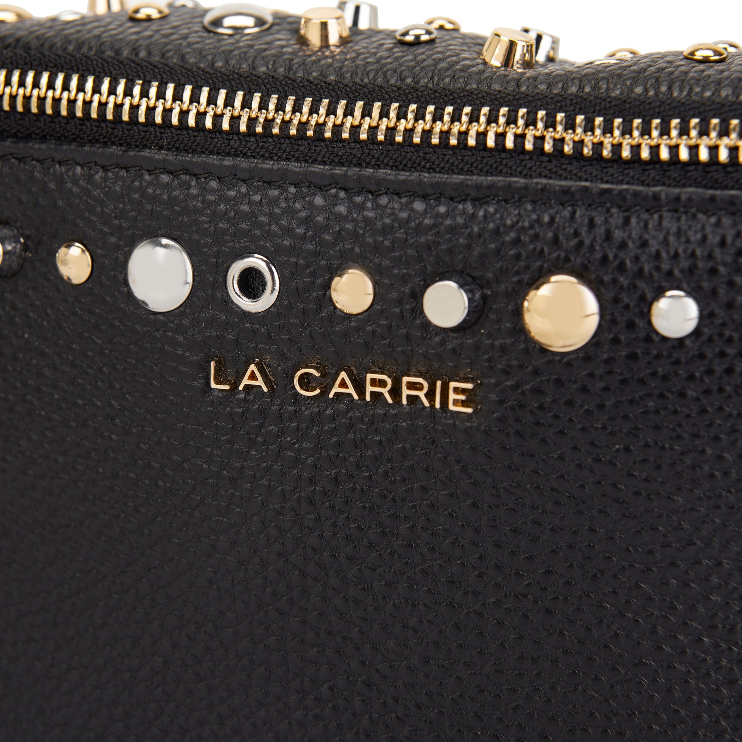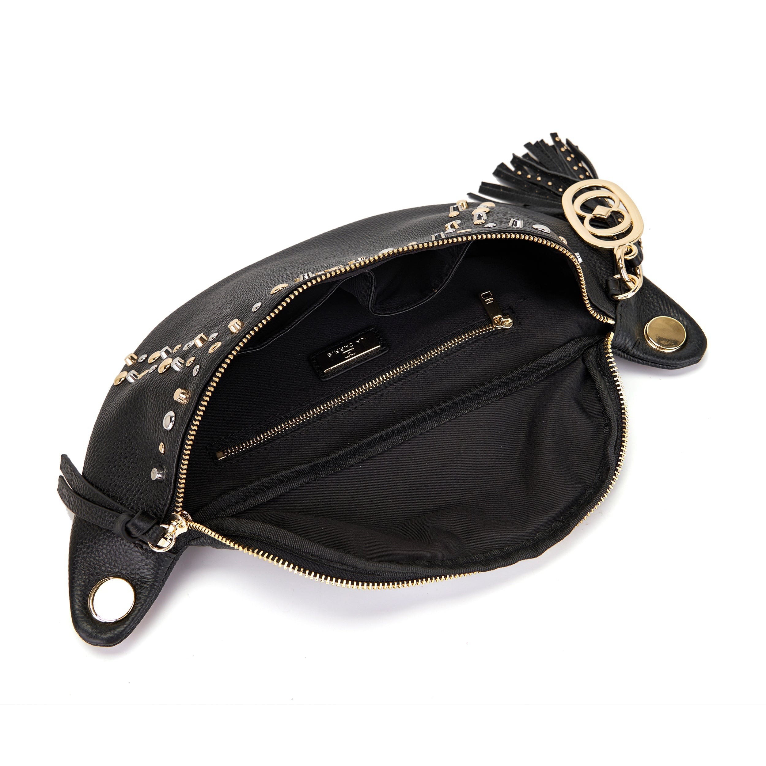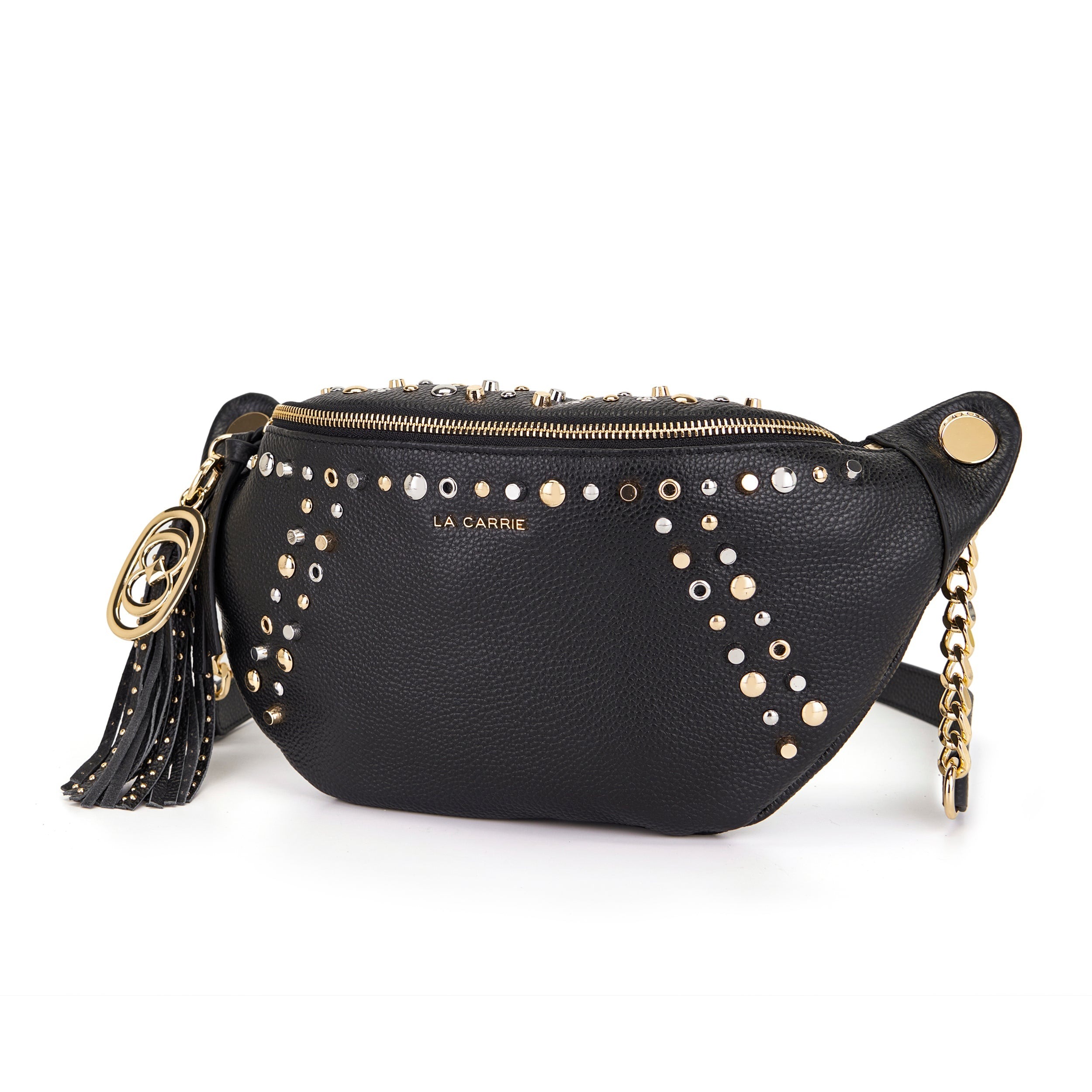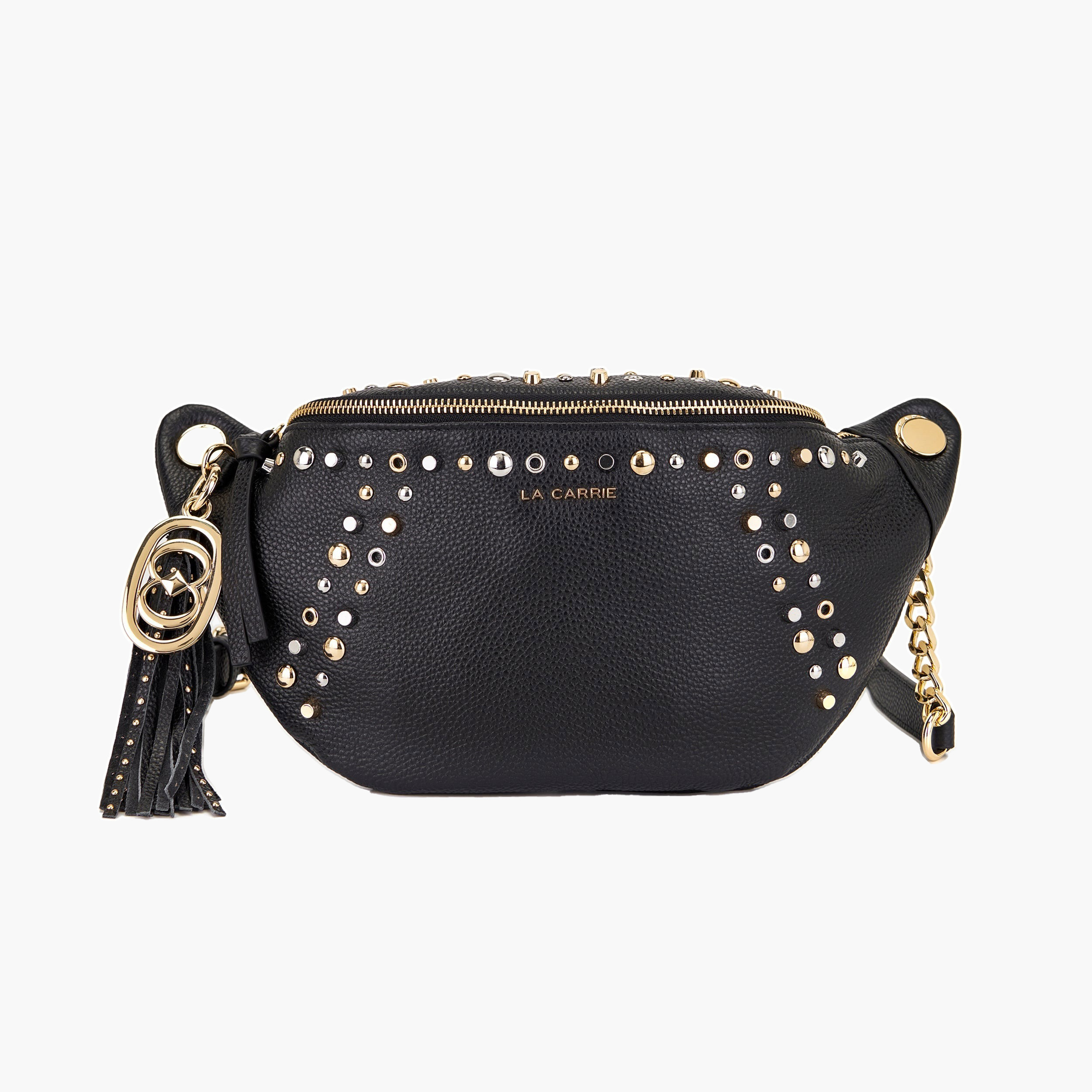 La Carrie Marsupio com Tachas (Ref. 152P-MB-155-TBL_BLA) – Um cinto/marsúpio moderno em eco-pele martelada, com tachas ao longo dos perfis que realçam o design urbano e irreverente.