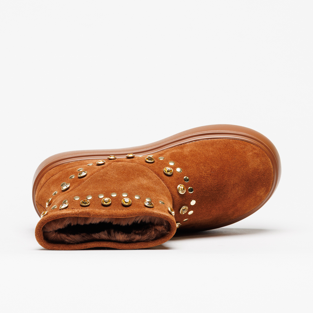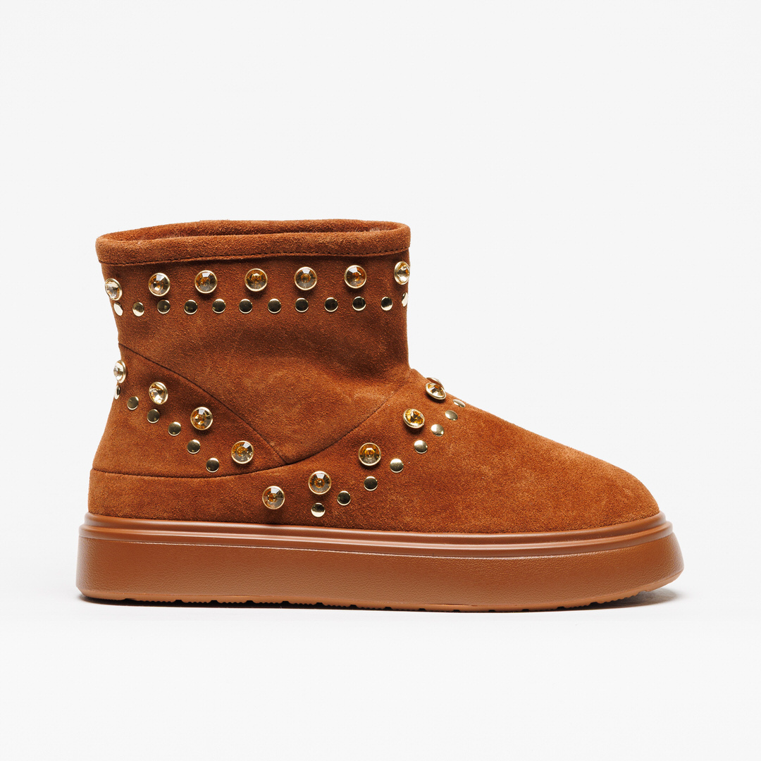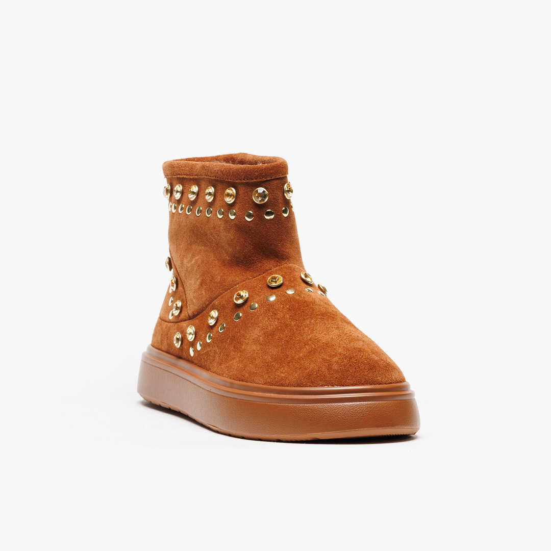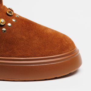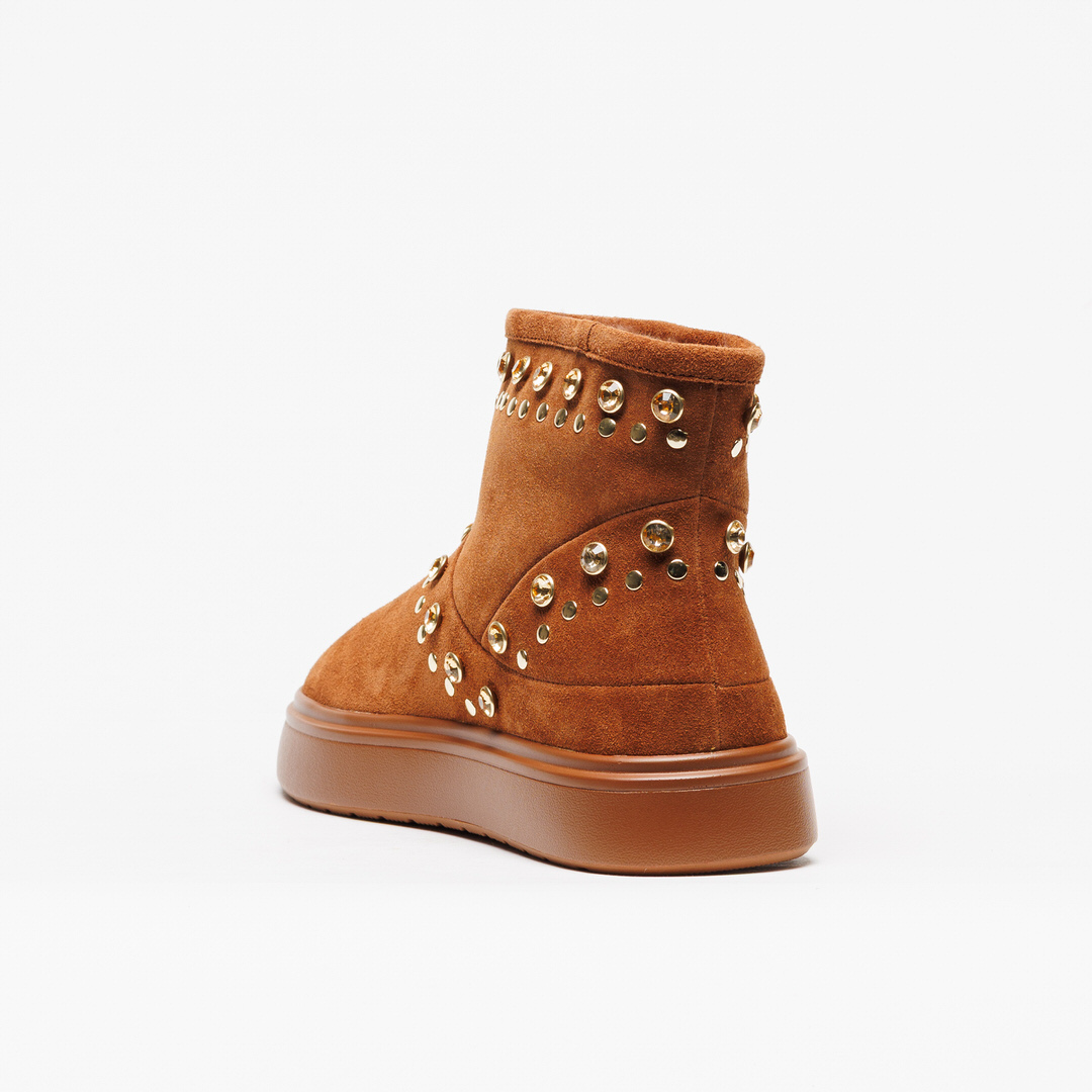 Bota Emanuelle Vee Deep Cuoio, da Nova Coleção Outono / Inverno, em camurça castanha com tachas douradas aplicadas que lhe conferem um toque de brilho e irreverência.