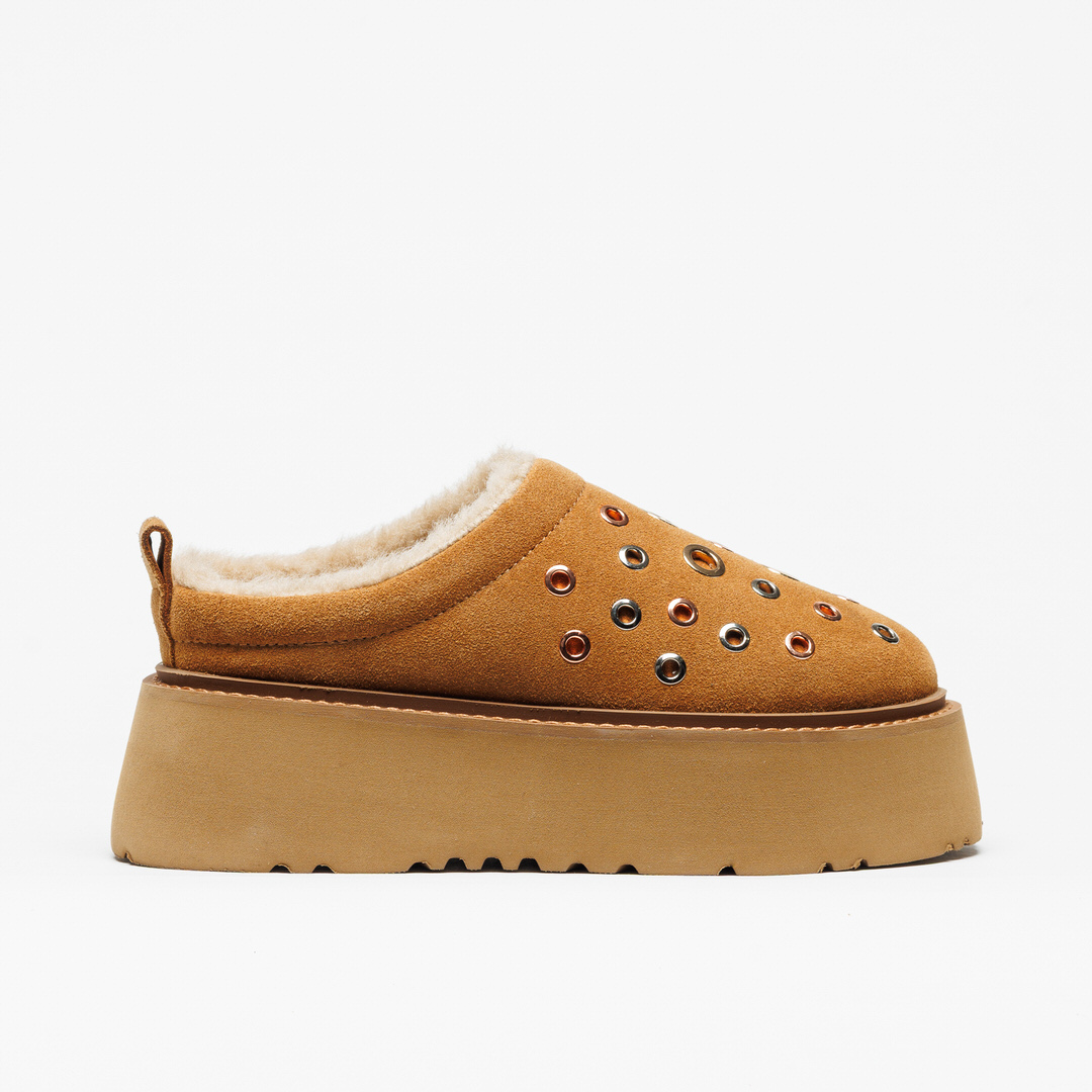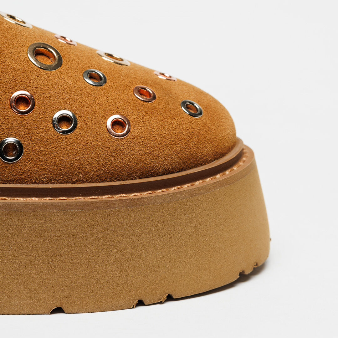 A sola alta com efeito plataforma garante um look moderno e confortável, enquanto os ilhós metálicos multicolor acrescentam um toque original e irreverente. Perfeito para quem procura um visual casual com personalidade.