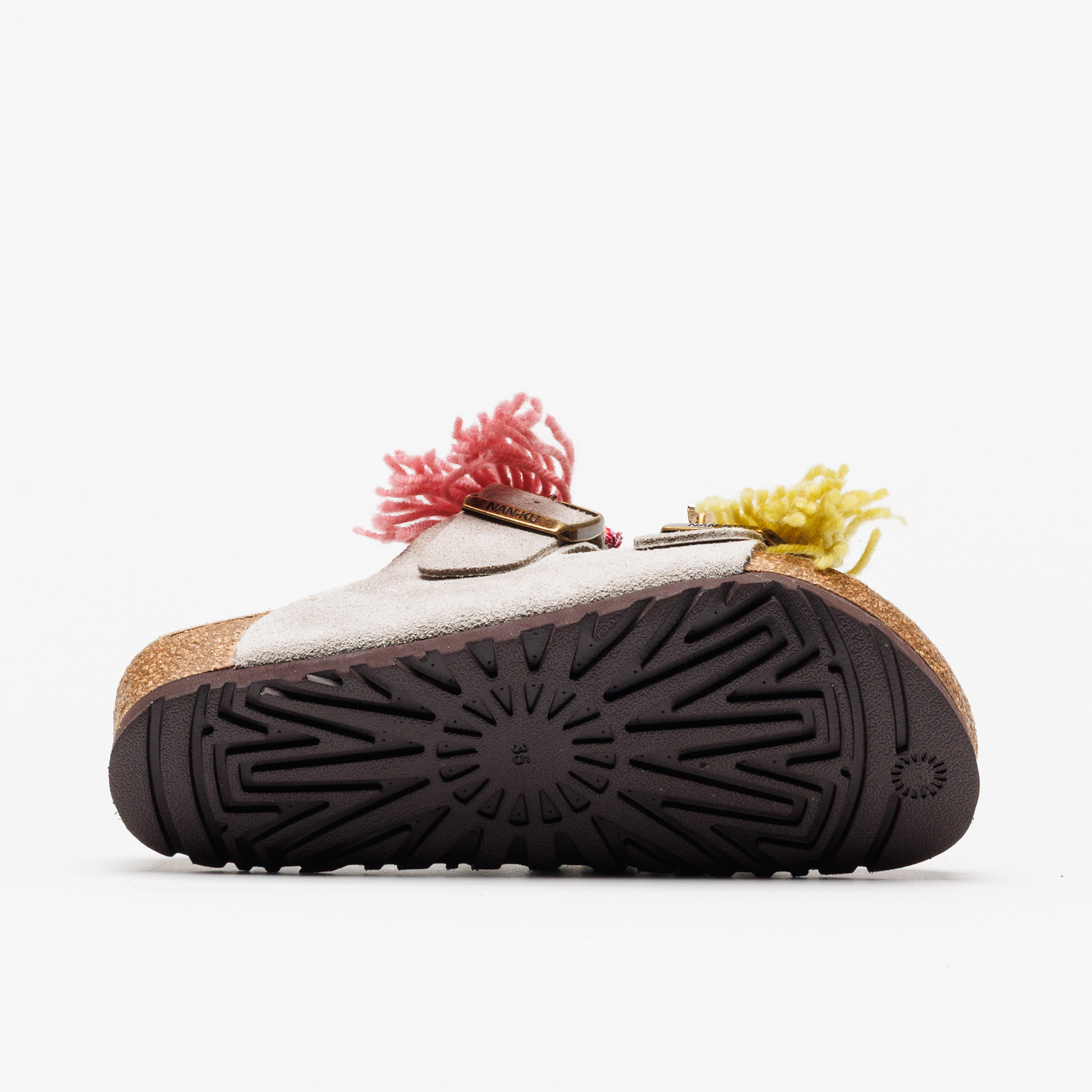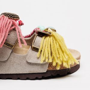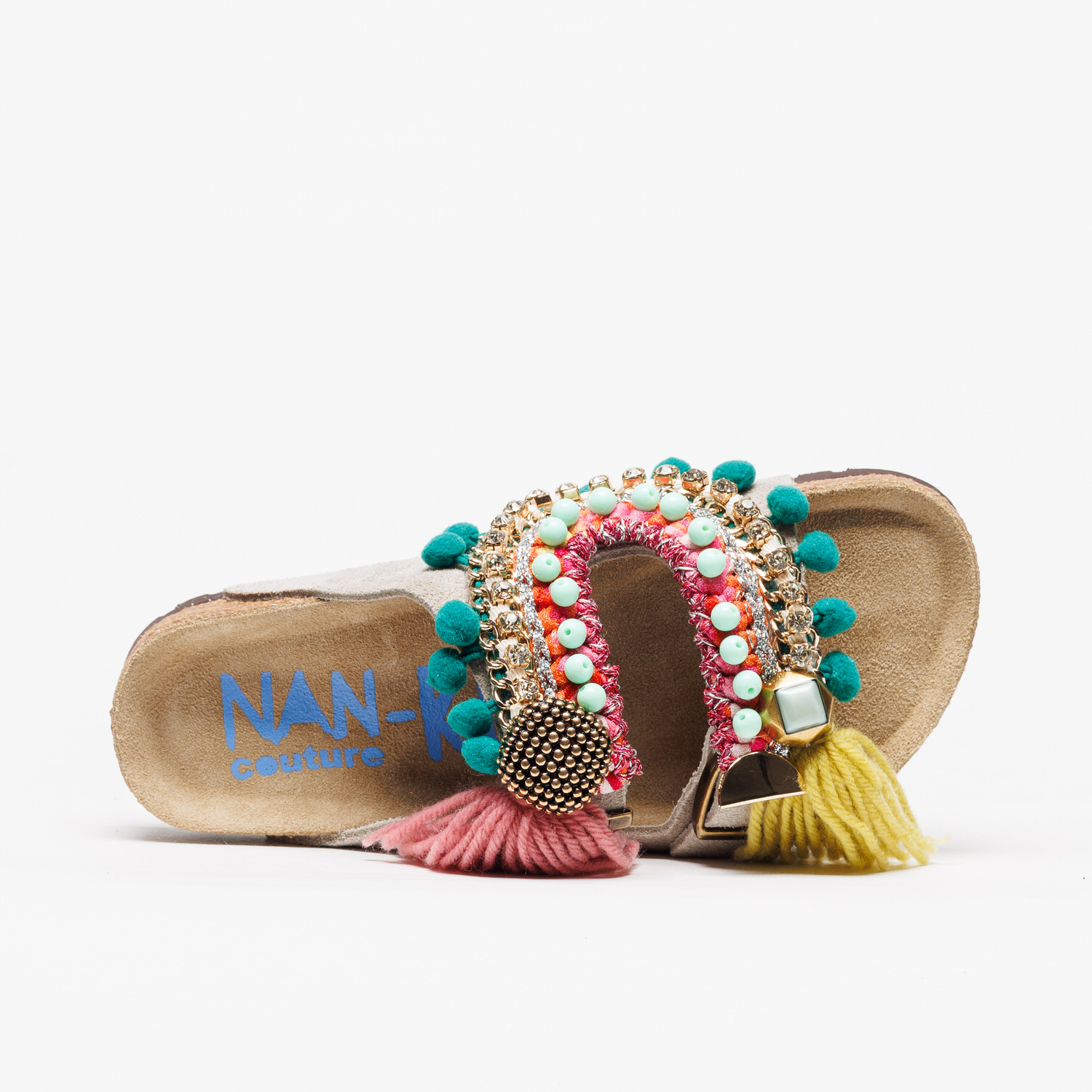 Com uma base confortável tipo anatómica e tiras em camurça, este modelo ganha destaque pelas aplicações decorativas coloridas — franjas, missangas e pompons — que criam um visual único e muito divertido.