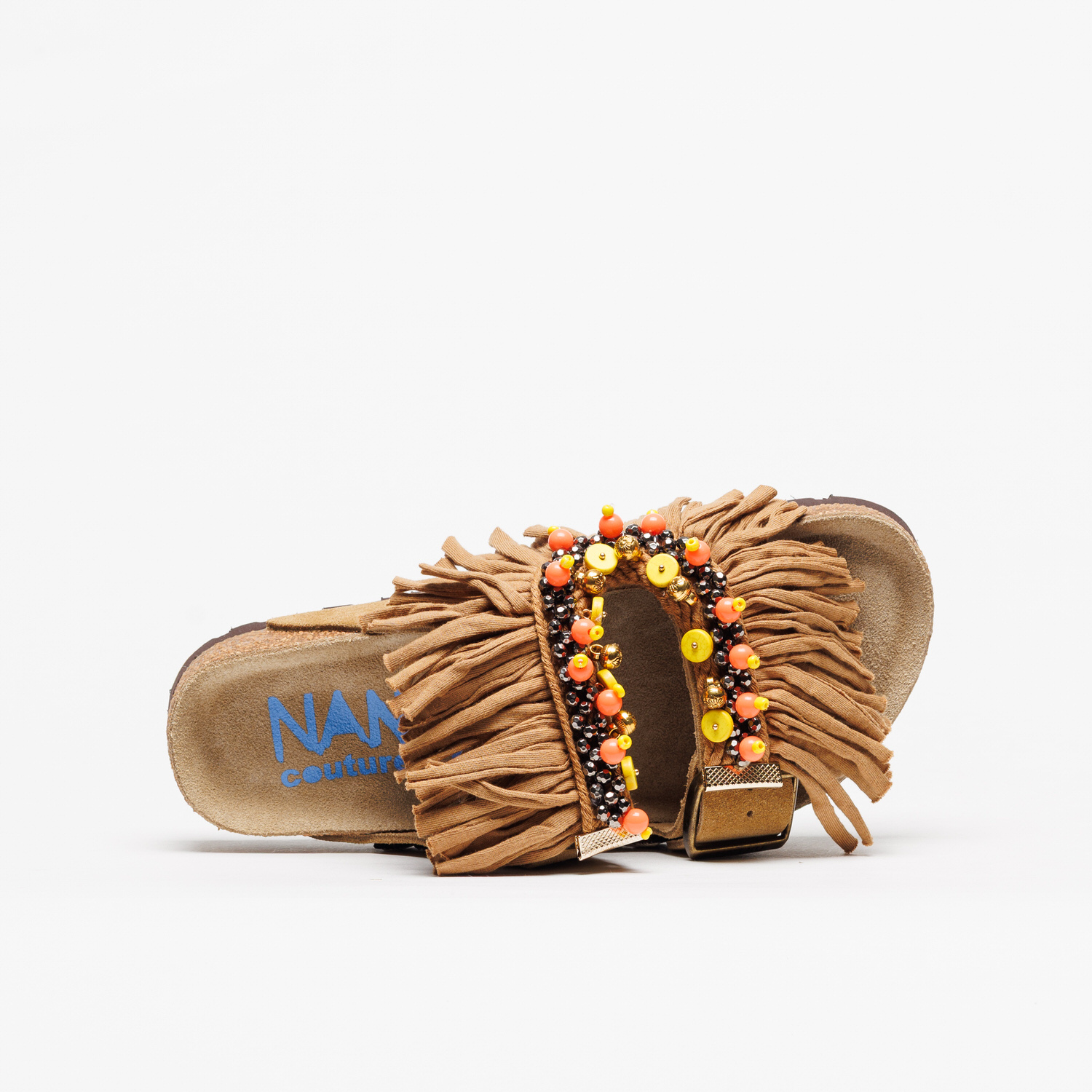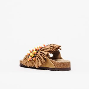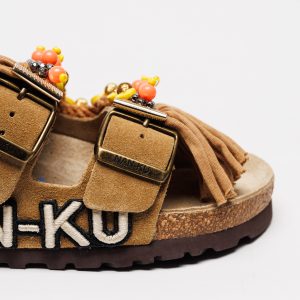 Destaca-se pelos detalhes artesanais com franjas, missangas e aplicações coloridas que conferem textura e um estilo boho marcante. A sola anatómica em cortiça proporciona estabilidade e conforto, complementando um visual distinto e contemporâneo.