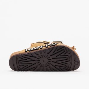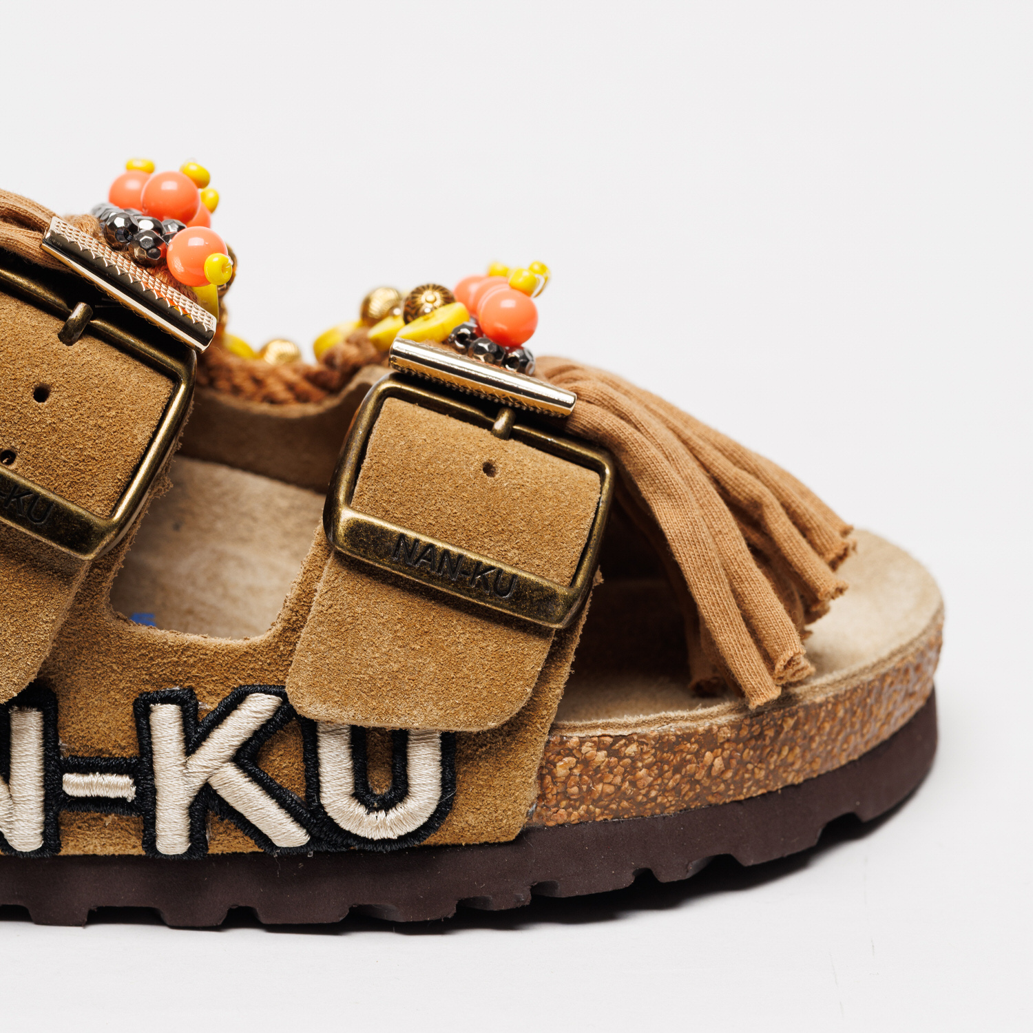 O chinelo Nan-Ku EBK-03 Camel apresenta um design em tom camel com acabamento em camurça e dupla fivela ajustável em metal, garantindo um ajuste confortável e seguro.