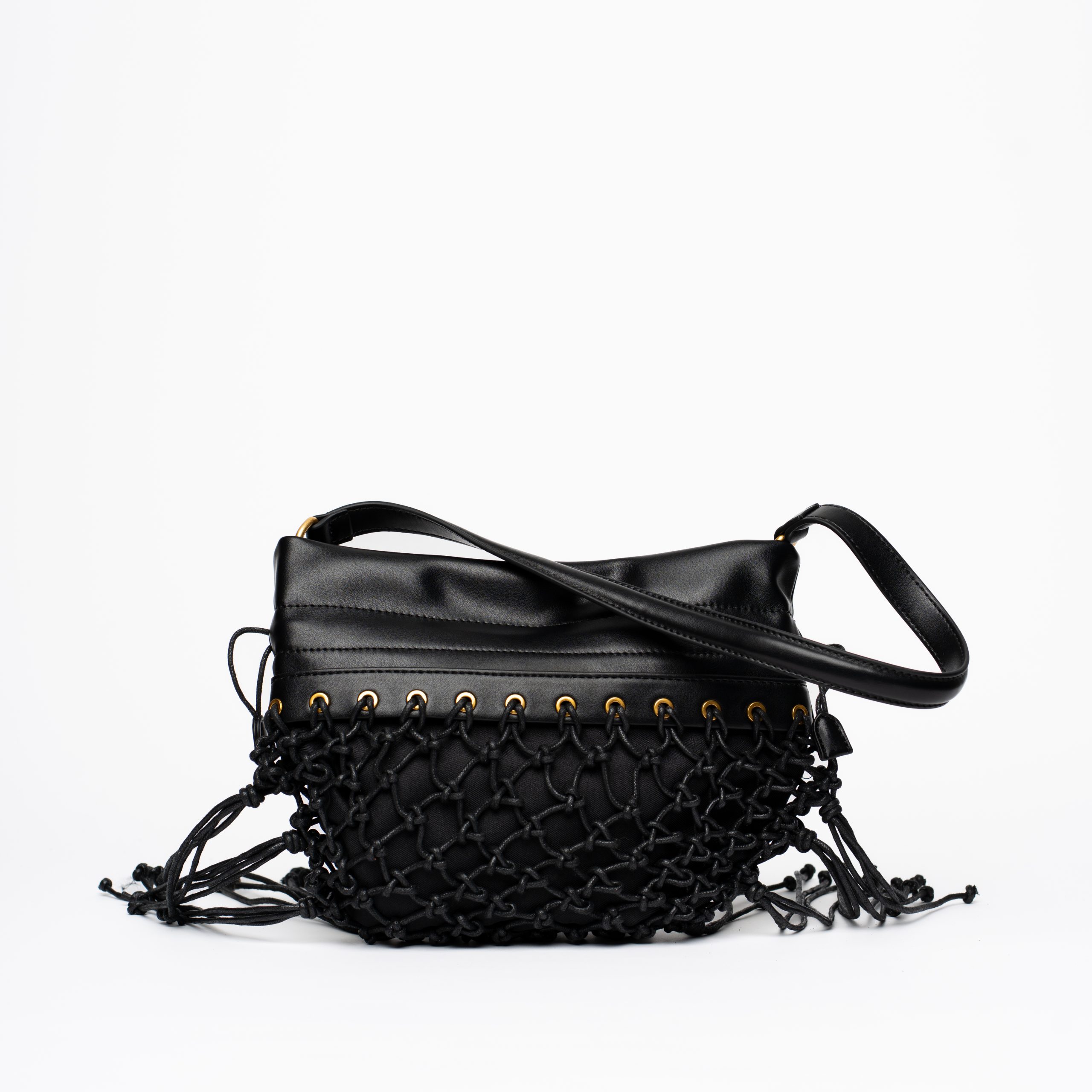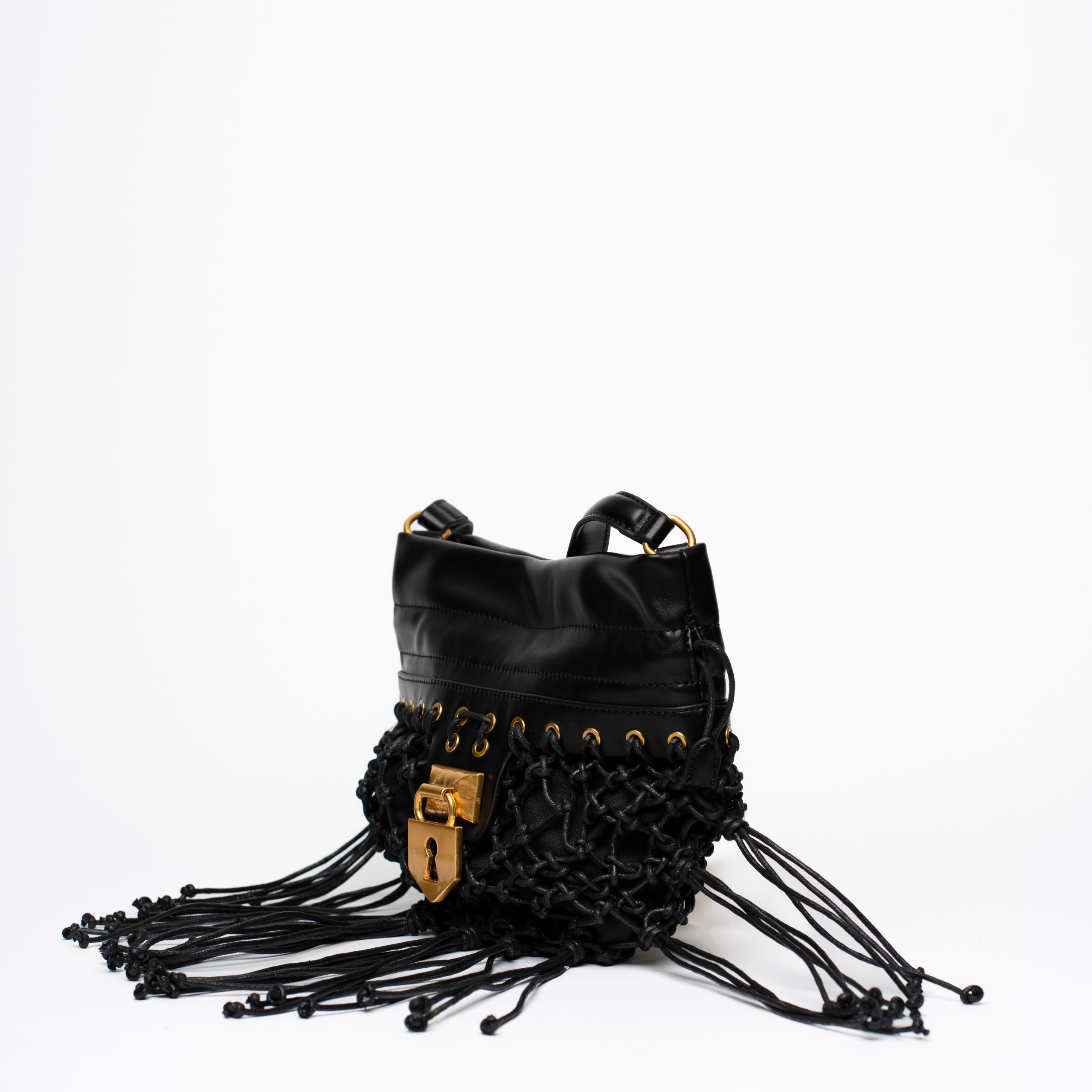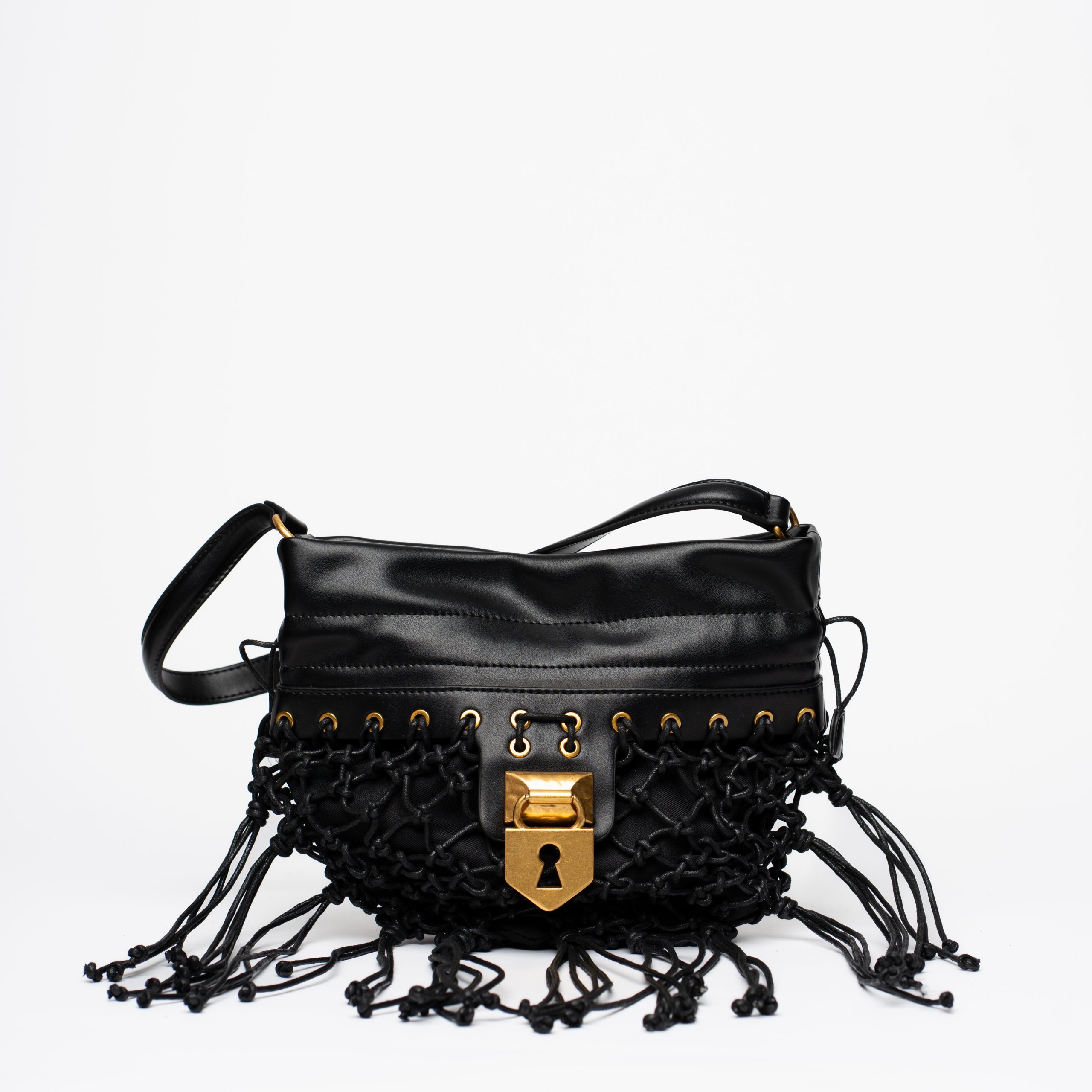 Mala La Carrie Fringe em preto com design contemporâneo e detalhes marcantes, destacando-se pela aplicação de franjas e efeito entrançado na parte frontal, que confere movimento e textura.