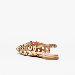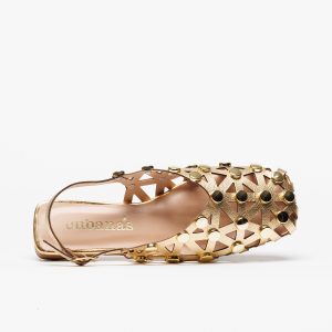 Com acabamento metalizado em tom gold, aplicação de tachas douradas e design recortado geométrico, este modelo destaca-se pelo brilho sofisticado e pelo efeito tendência que transforma qualquer look de verão.
