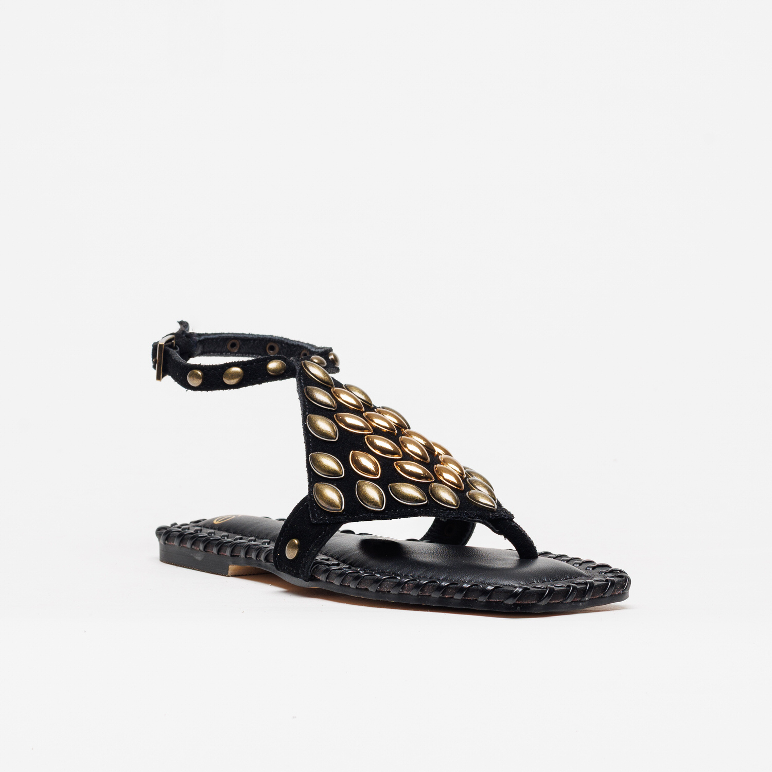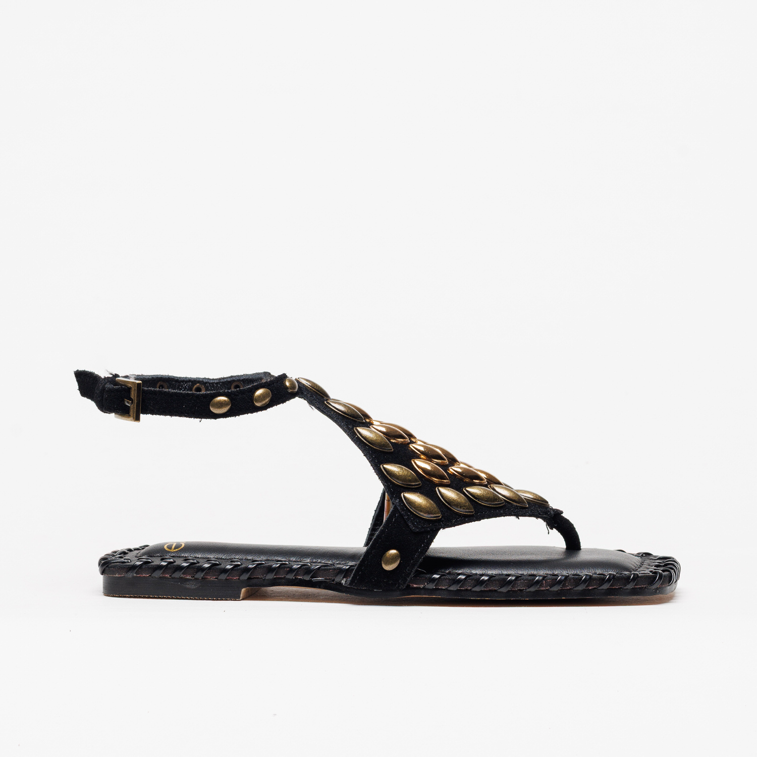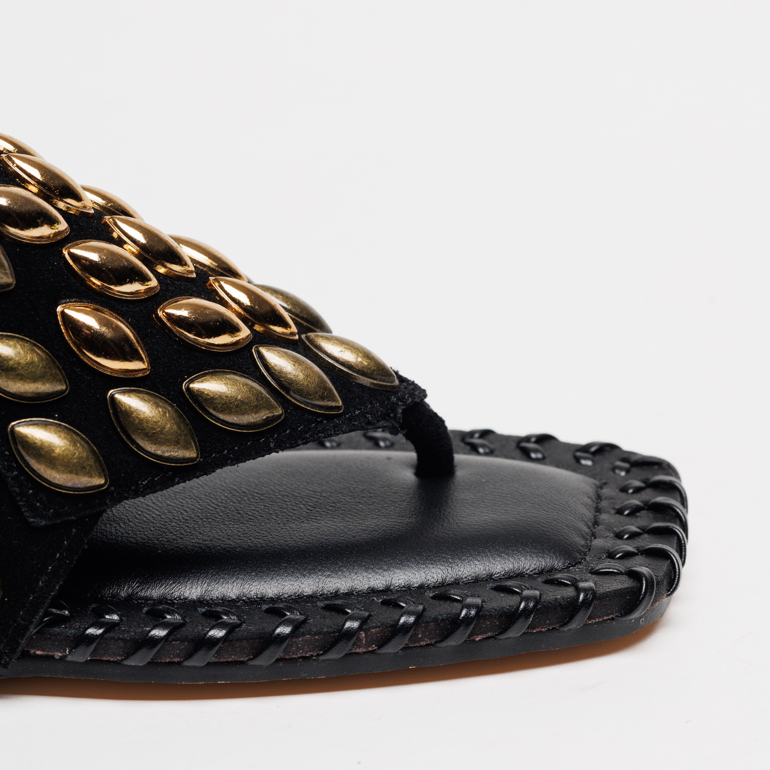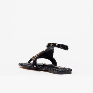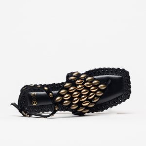 A sandália Exé 815-1 Black destaca-se pelo design arrojado em preto com aplicações metálicas douradas, criando um visual moderno e cheio de atitude.