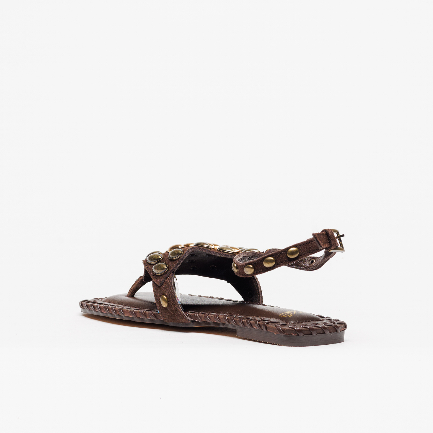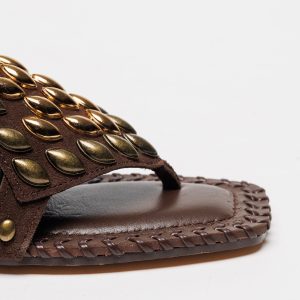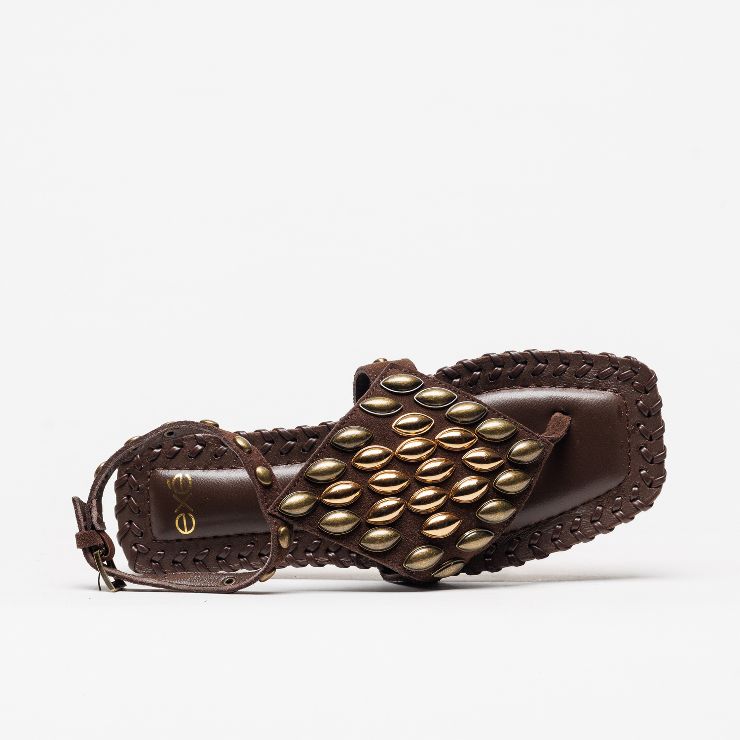 A sandália Exé 815-1 Brown destaca-se pelo design arrojado em Castanho om aplicações metálicas douradas, criando um visual moderno e cheio de atitude.