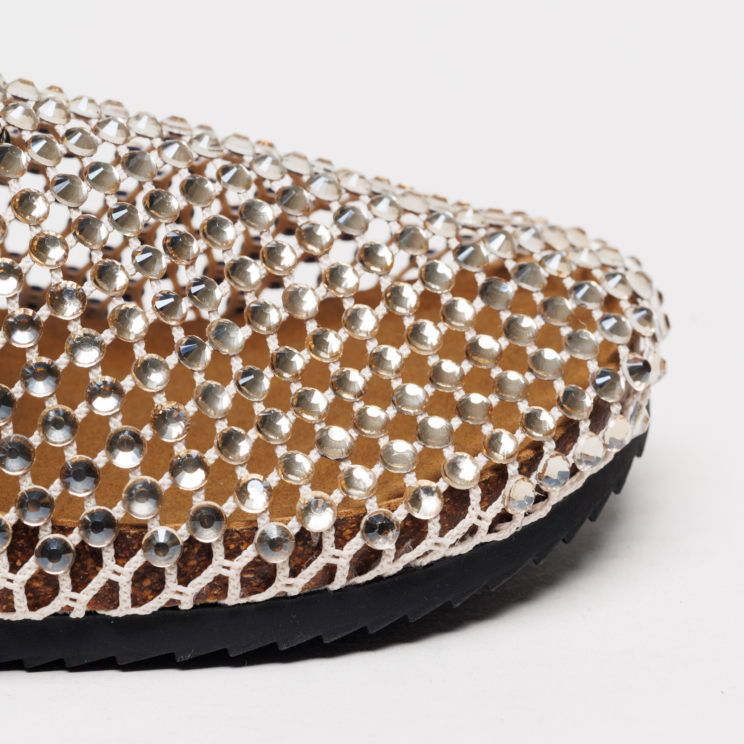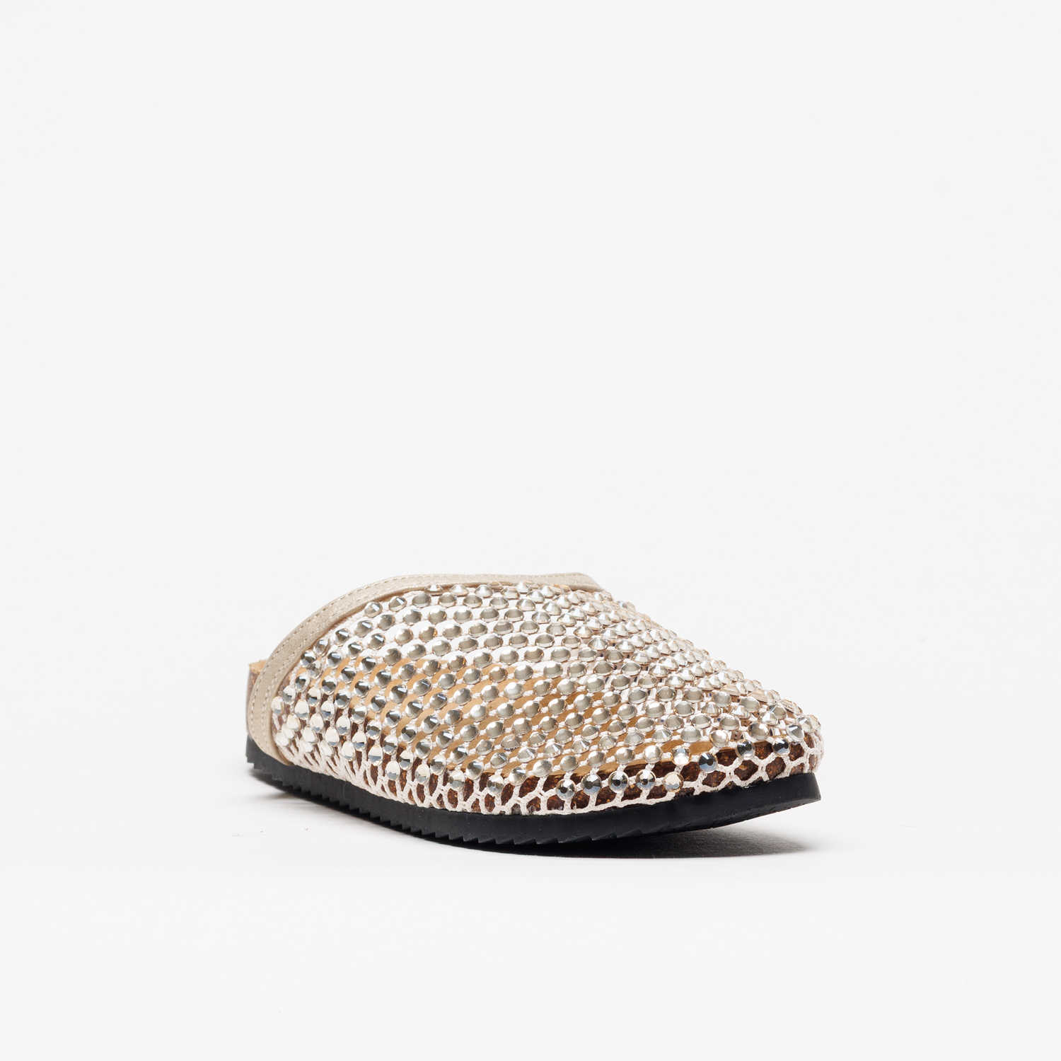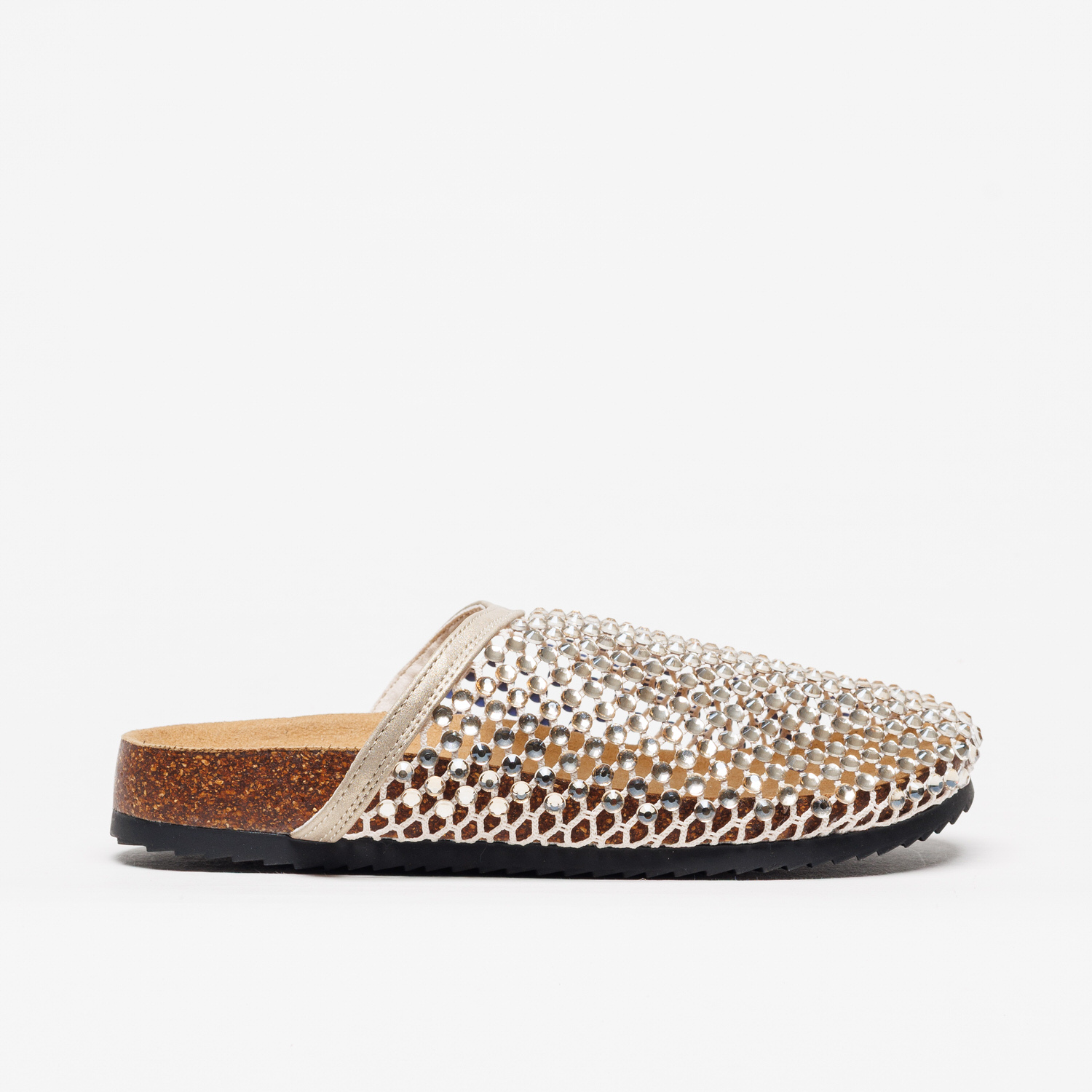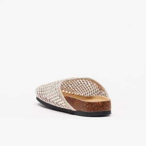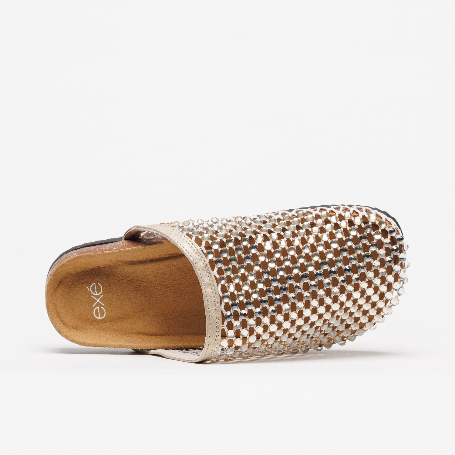 A sandália Exé YB25C8-1 Gold destaca-se pelo design mule em malha com aplicações brilhantes, criando um efeito sofisticado e luminoso que eleva qualquer look.