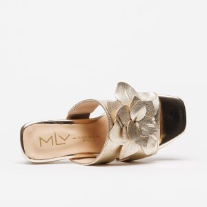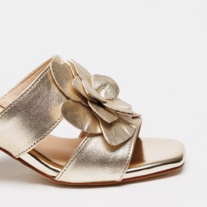 Este modelo apresenta duas tiras largas em tom dourado metalizado que envolvem o pé com conforto, enquanto o detalhe floral aplicado na parte superior acrescenta um toque feminino e delicado. O acabamento brilhante realça o carácter elegante da sandália, tornando-a perfeita para ocasiões especiais ou para elevar um look casual.