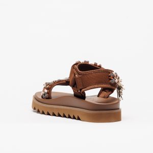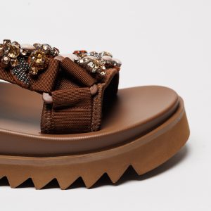 Sandália Nan-Ku EKS-01L Coffee de inspiração contemporânea com design marcante, combinando conforto e sofisticação. Apresenta tiras em tom coffee enriquecidas com aplicações de pedrarias, pérolas e detalhes brilhantes que conferem um visual elegante e distinto.