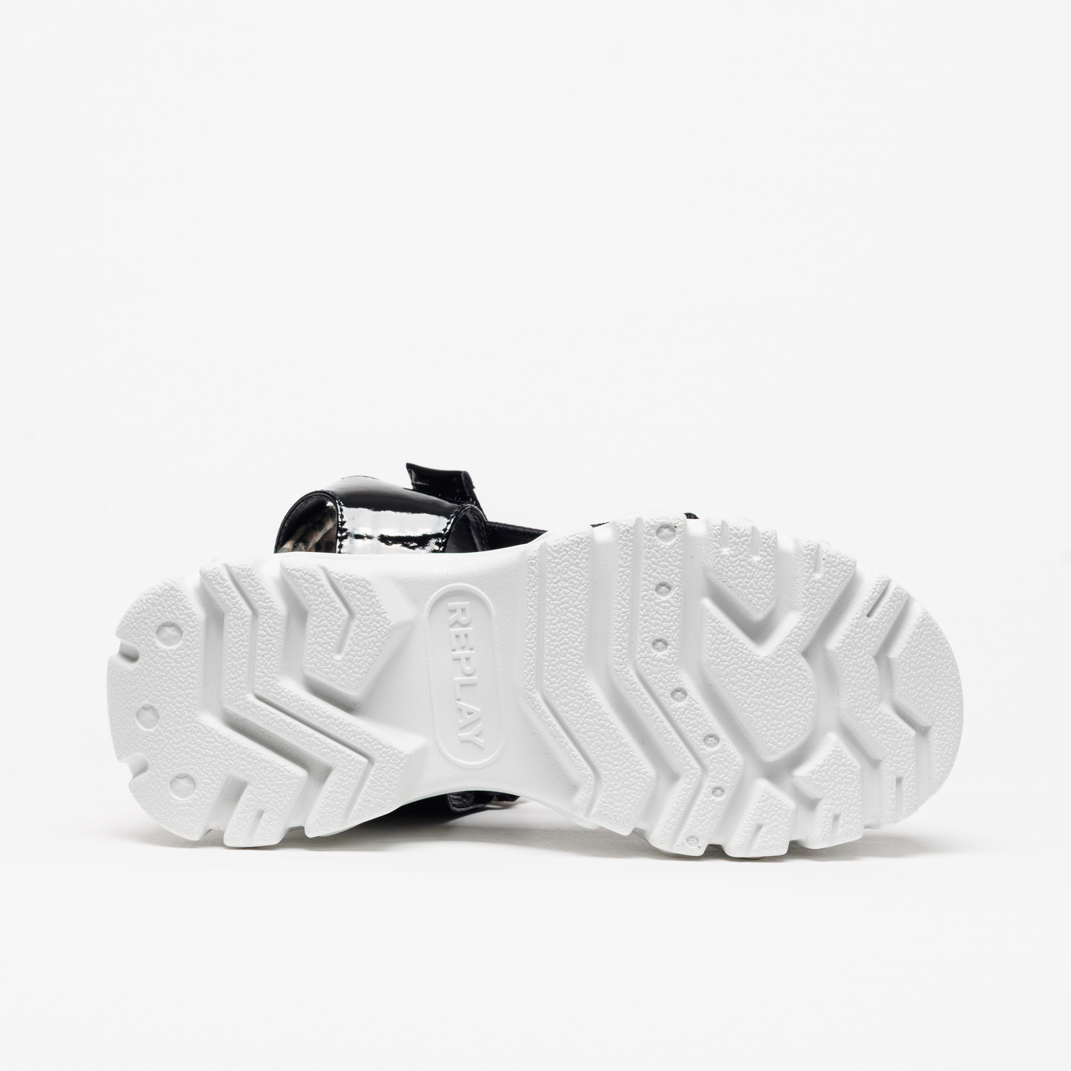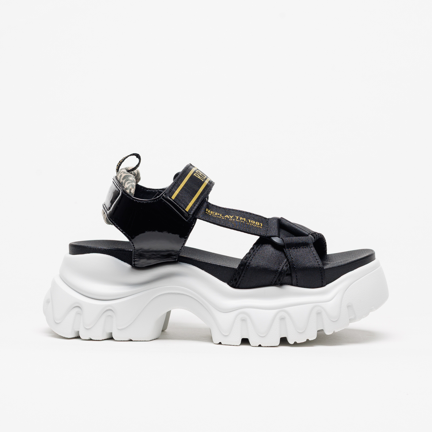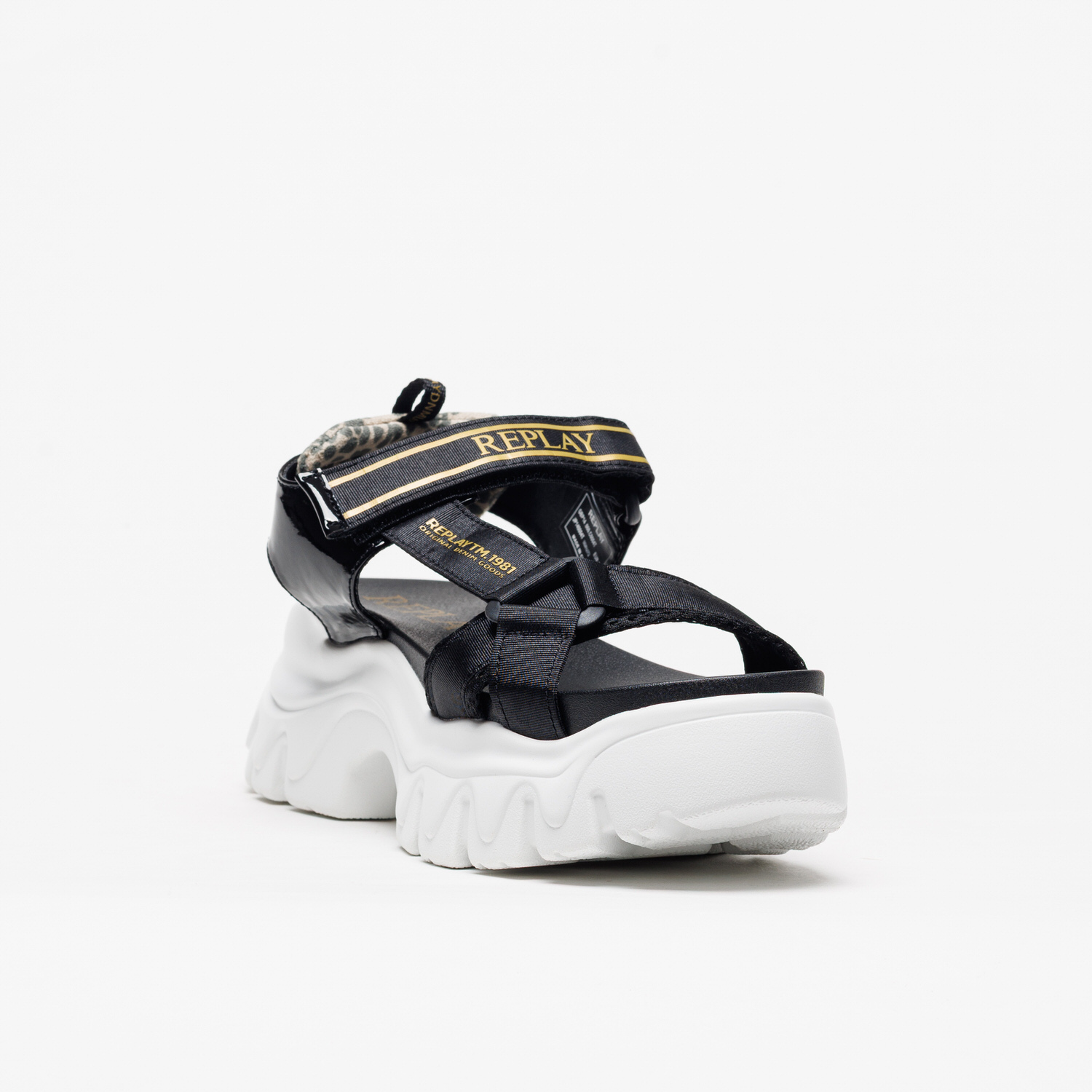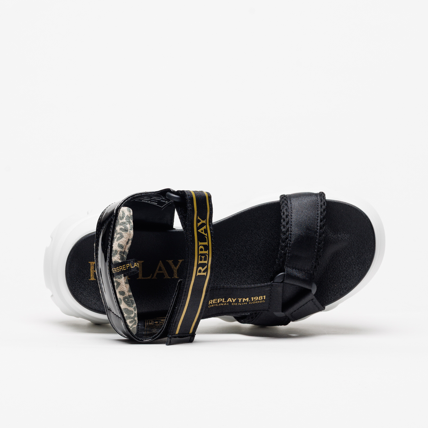A sandália Replay Juyce Jr 4 Black Gold destaca-se pelo seu estilo moderno e urbano, combinando tons em preto om um elegante acabamento dourado que lhe confere um toque sofisticado.