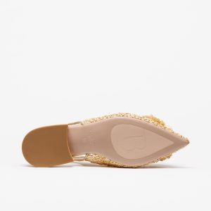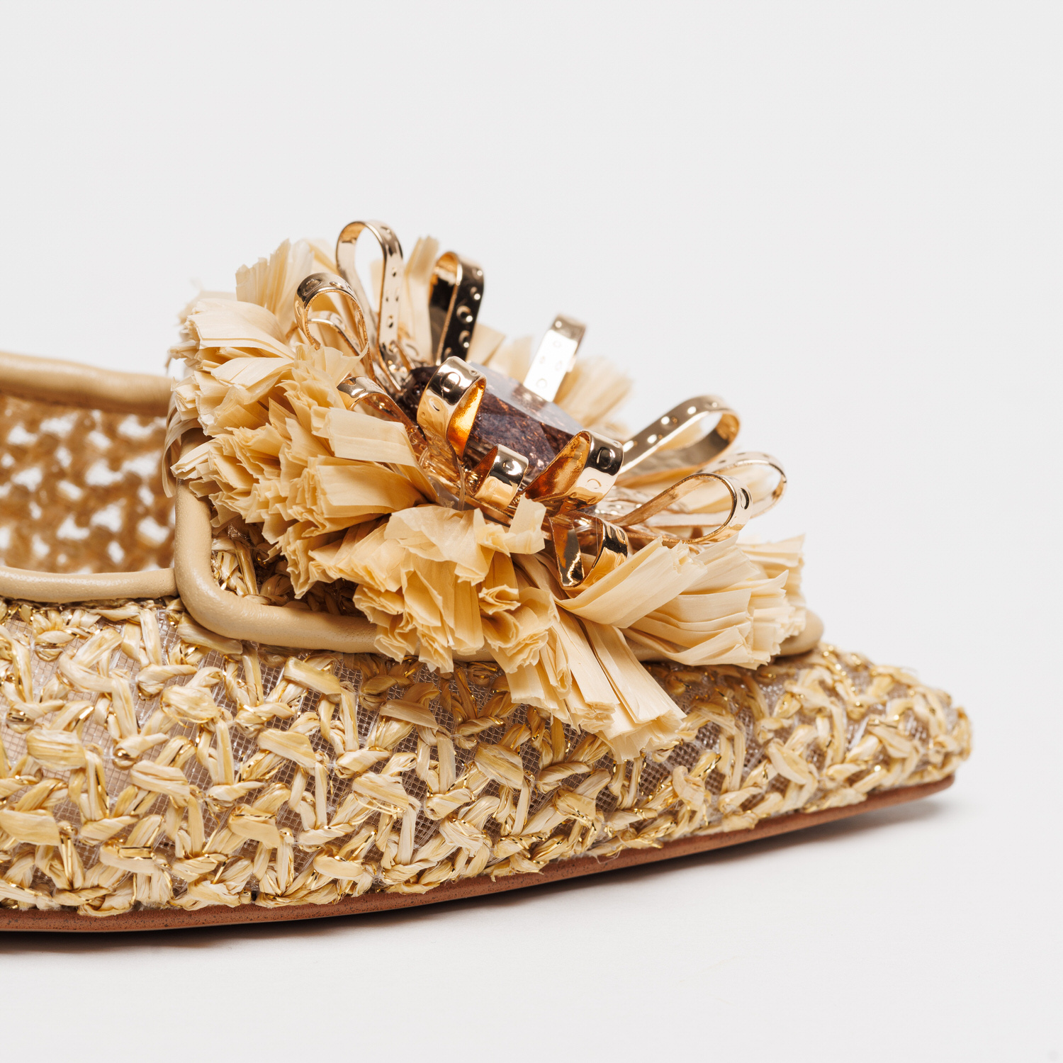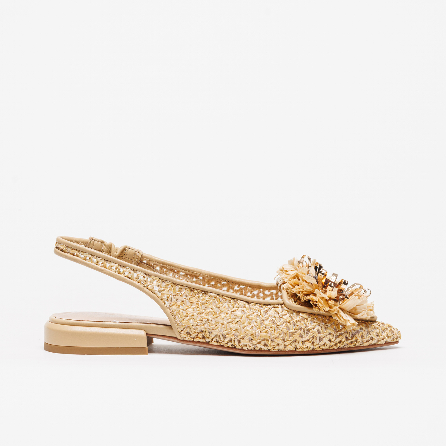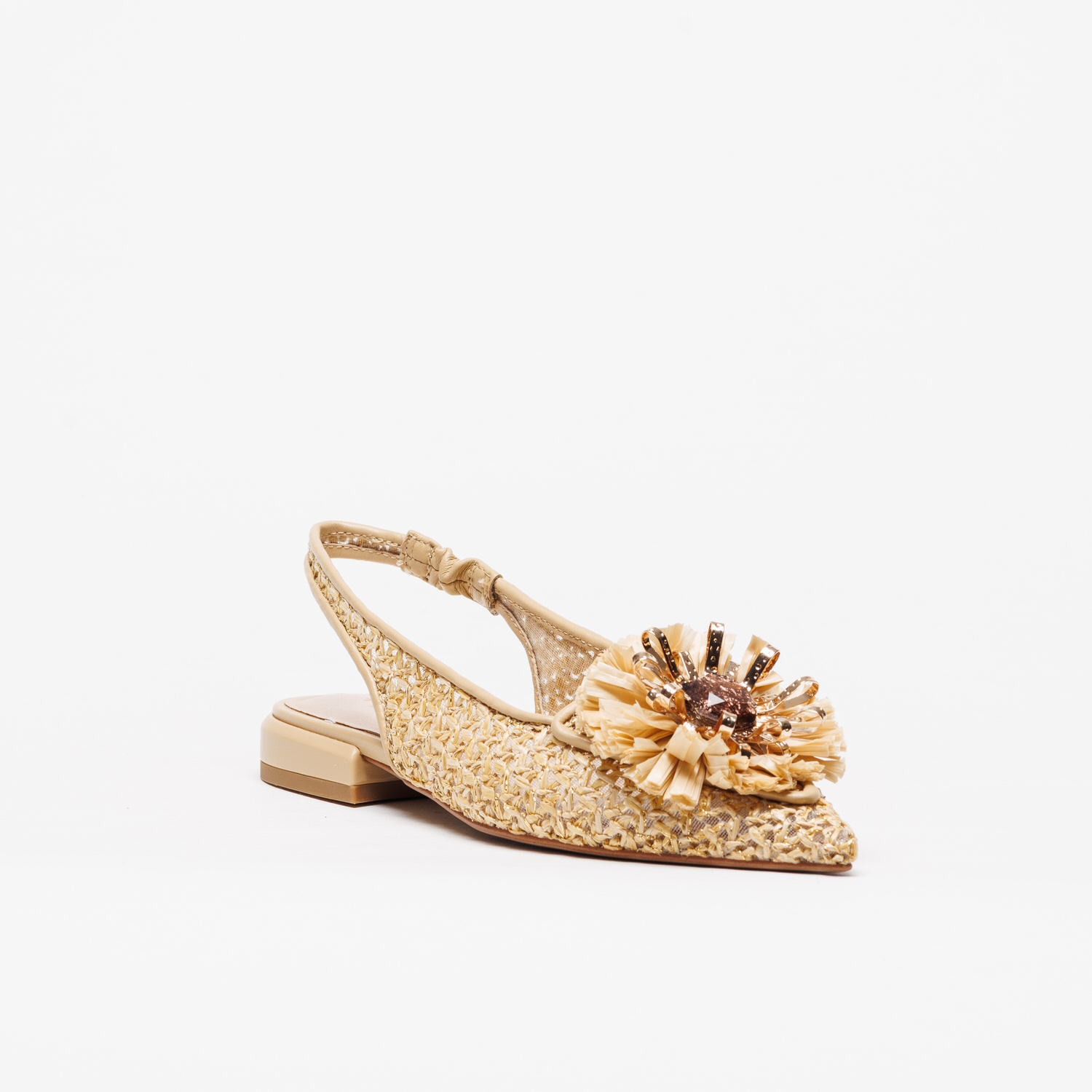 Com acabamento em ráfia entrançada e tons bege, este modelo transmite leveza e frescura, ideal para a estação primavera/verão. O detalhe floral aplicado na parte frontal, enriquecido com elementos decorativos, confere um toque feminino e requintado que eleva qualquer look.