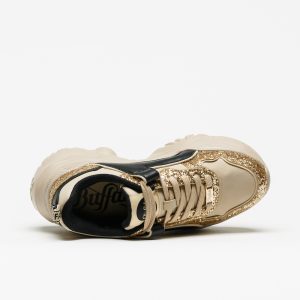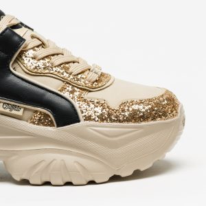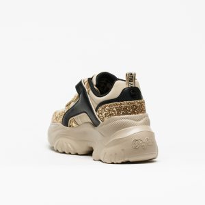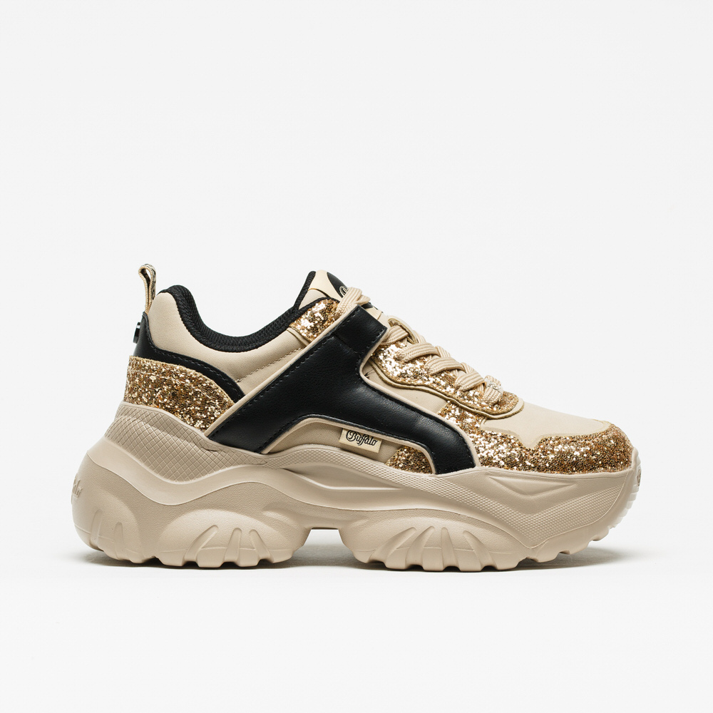 Sapatilhas da marca Buffalo Glam Gold Black, fazem parte da coleção Outono Inverno 2026.