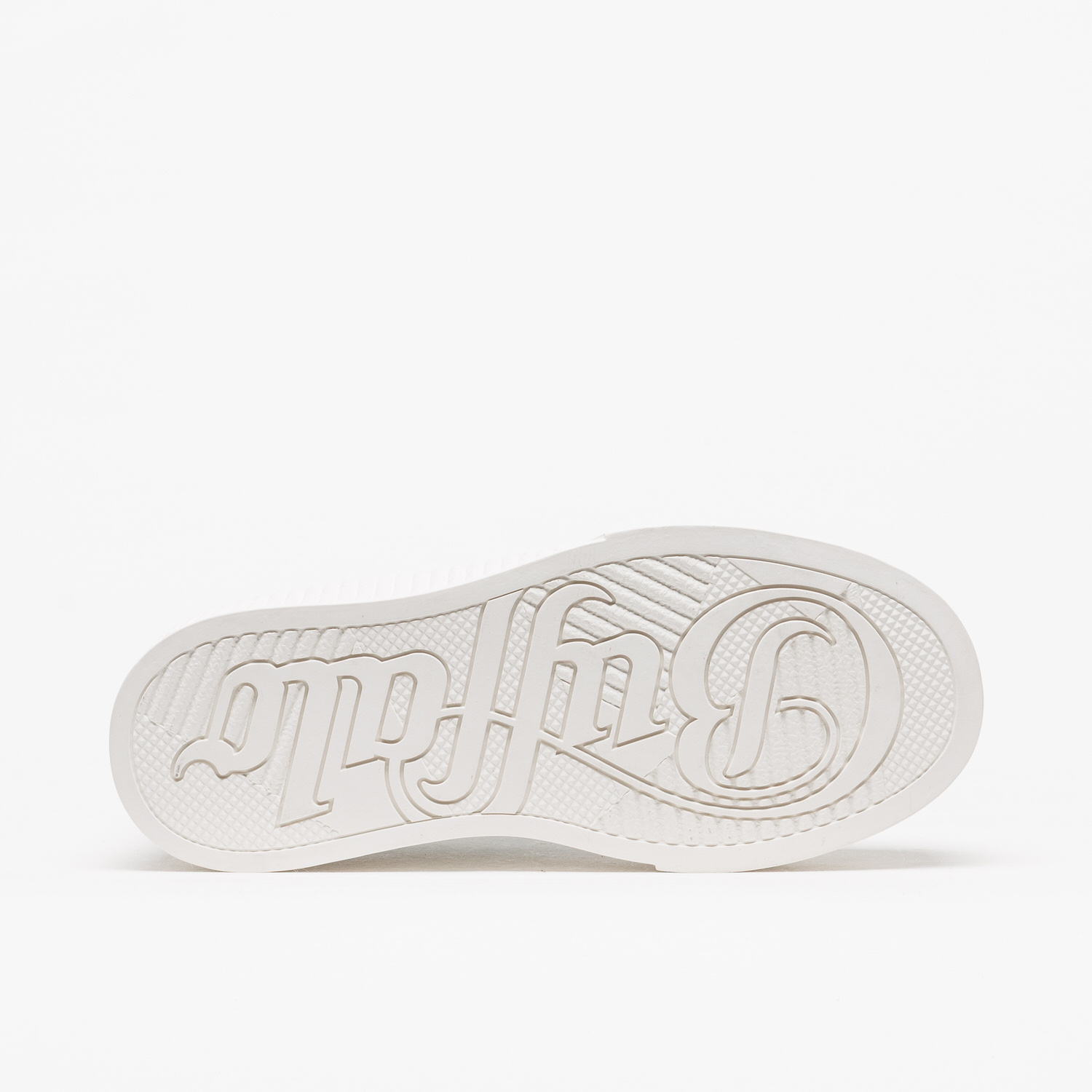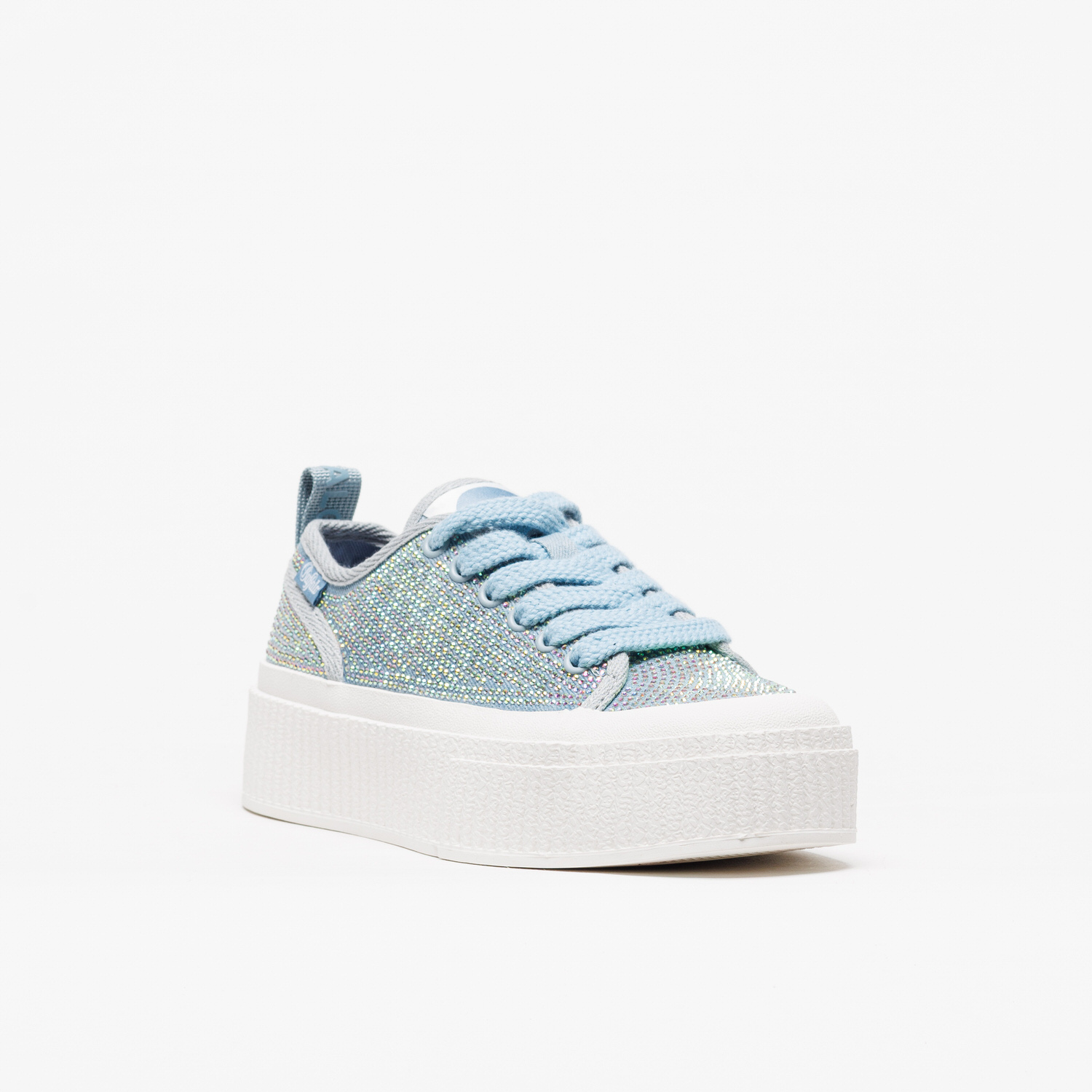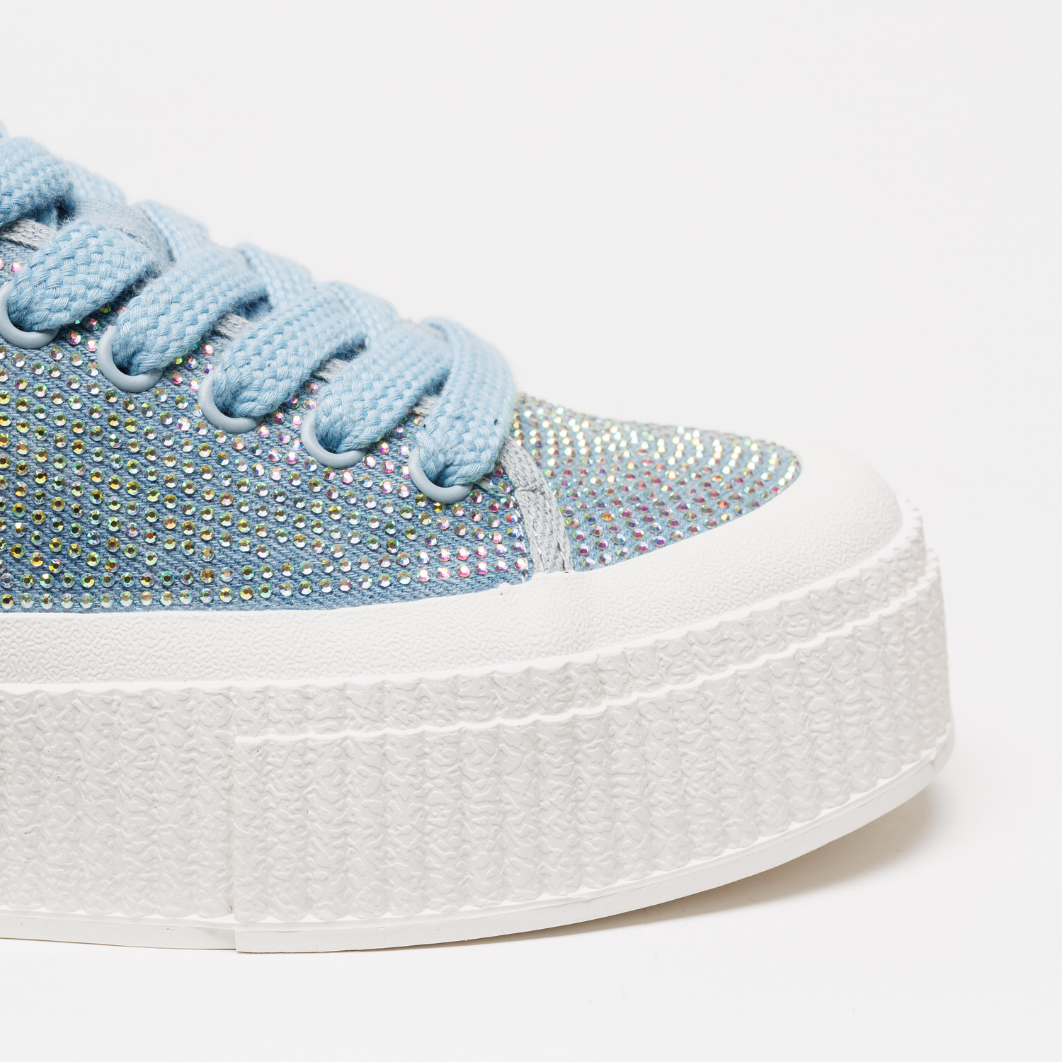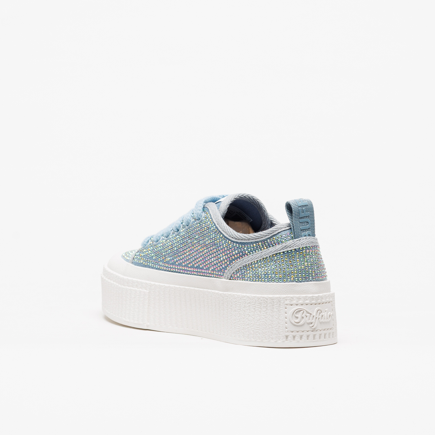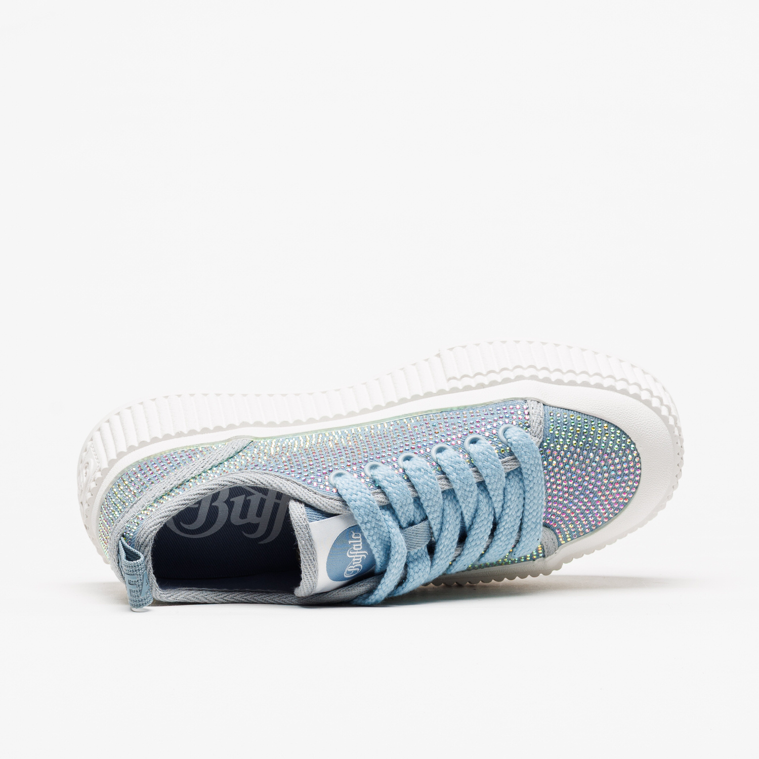 A sapatilha Buffalo Madison Glam Denim apresenta um design em tom azul claro com acabamento totalmente revestido a strass, criando um efeito brilhante e iridescente.
