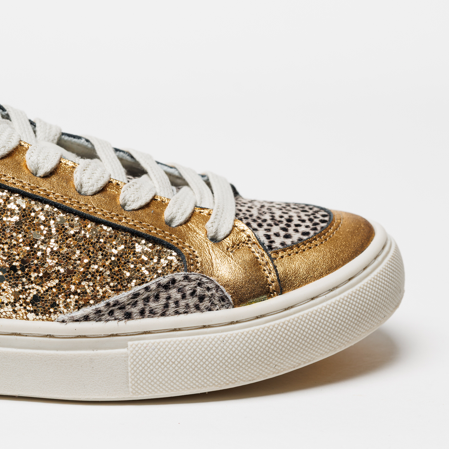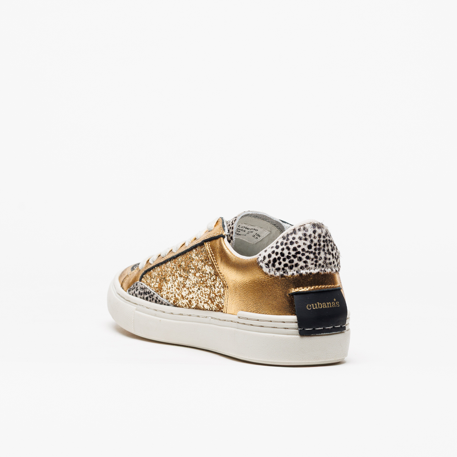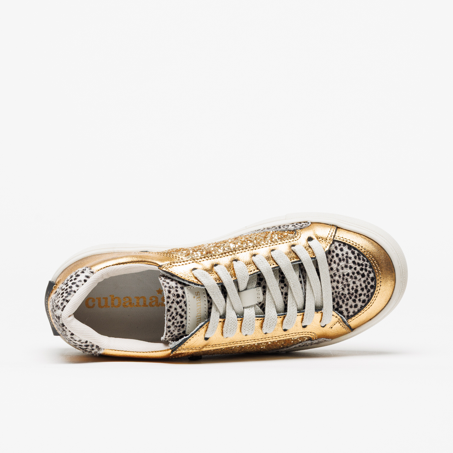A sapatilha Cubanas Glow 230 Gold combina pele metalizada dourada com painéis em glitter e apontamentos animal print, criando um look feminino, irreverente e cheio de personalidade para a nova estação.