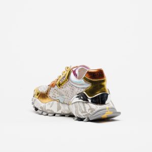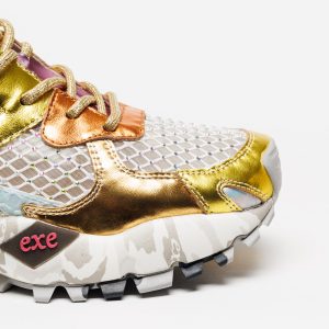 A sapatilha Exé 134-60 Yellow combina um design arrojado com tons dourados e amarelo vibrante, enriquecidos por detalhes metalizados e brilhos subtis que dão um toque moderno e irreverente.