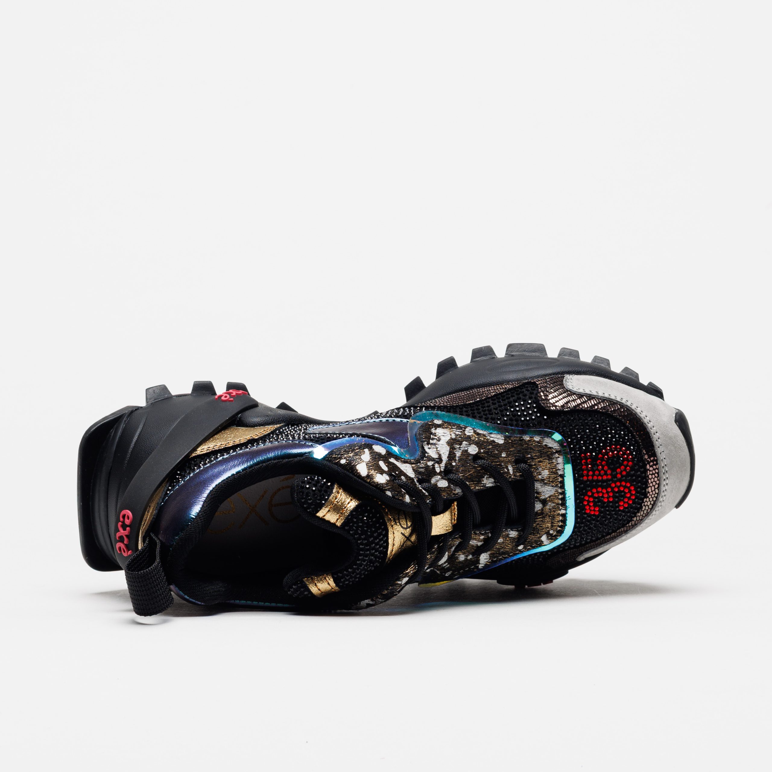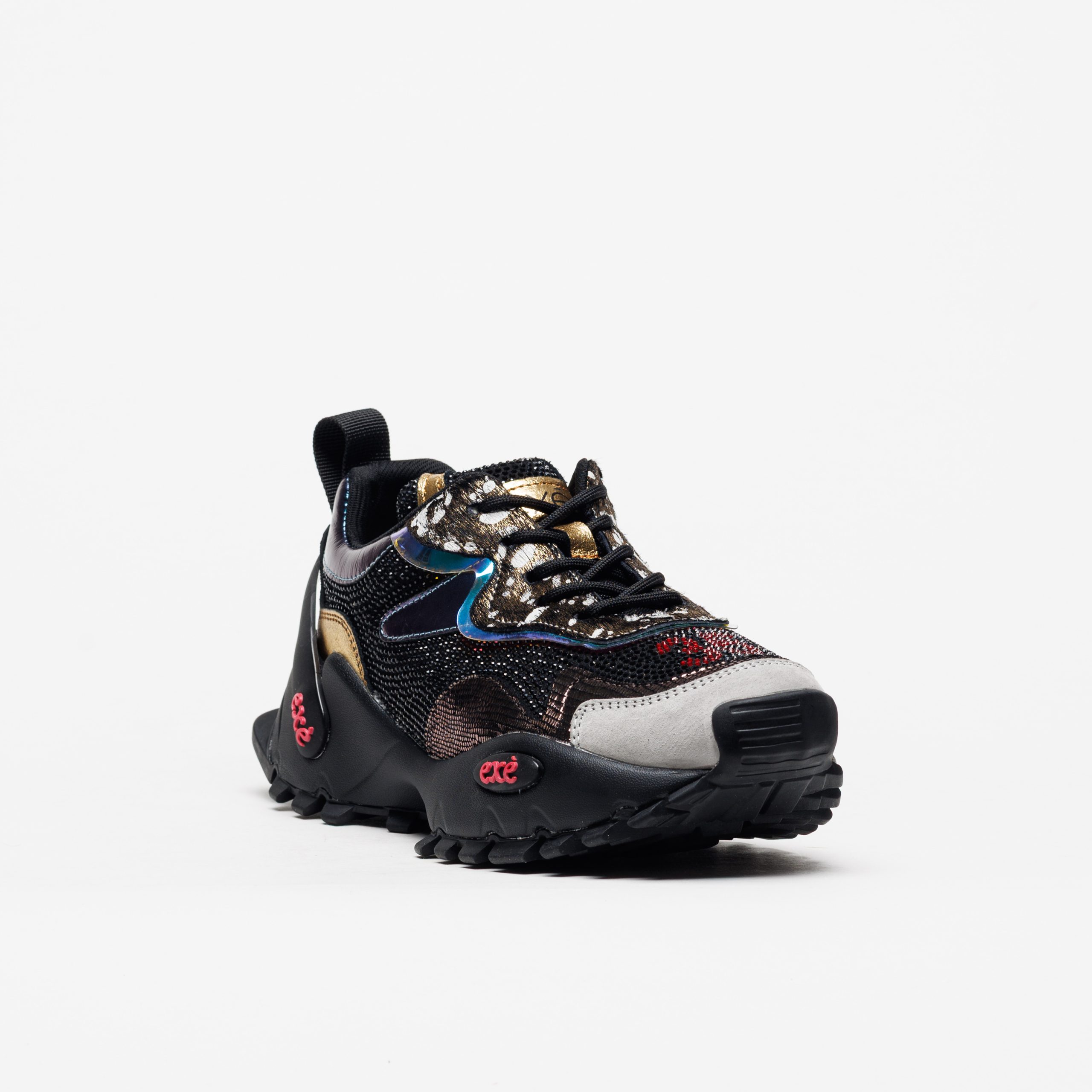 A sapatilha Exé 4032-1A Black Gold destaca-se pelo contraste sofisticado entre o preto profundo, os reflexos dourados e os apontamentos metalizados, criando um visual intenso e cheio de carácter.