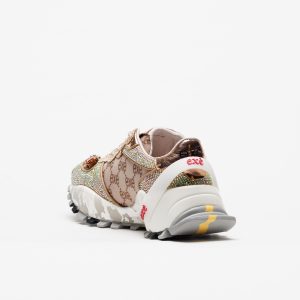 O exterior conjuga pele genuína com tecido estampado com o monograma Exé, enquanto as aplicações decorativas e os detalhes metalizados acrescentam carácter e um toque distintivo. A sola em borracha, com cerca de 4 cm atrás e 2,5 cm à frente, oferece estabilidade, conforto e uma pisada segura ao longo do dia.