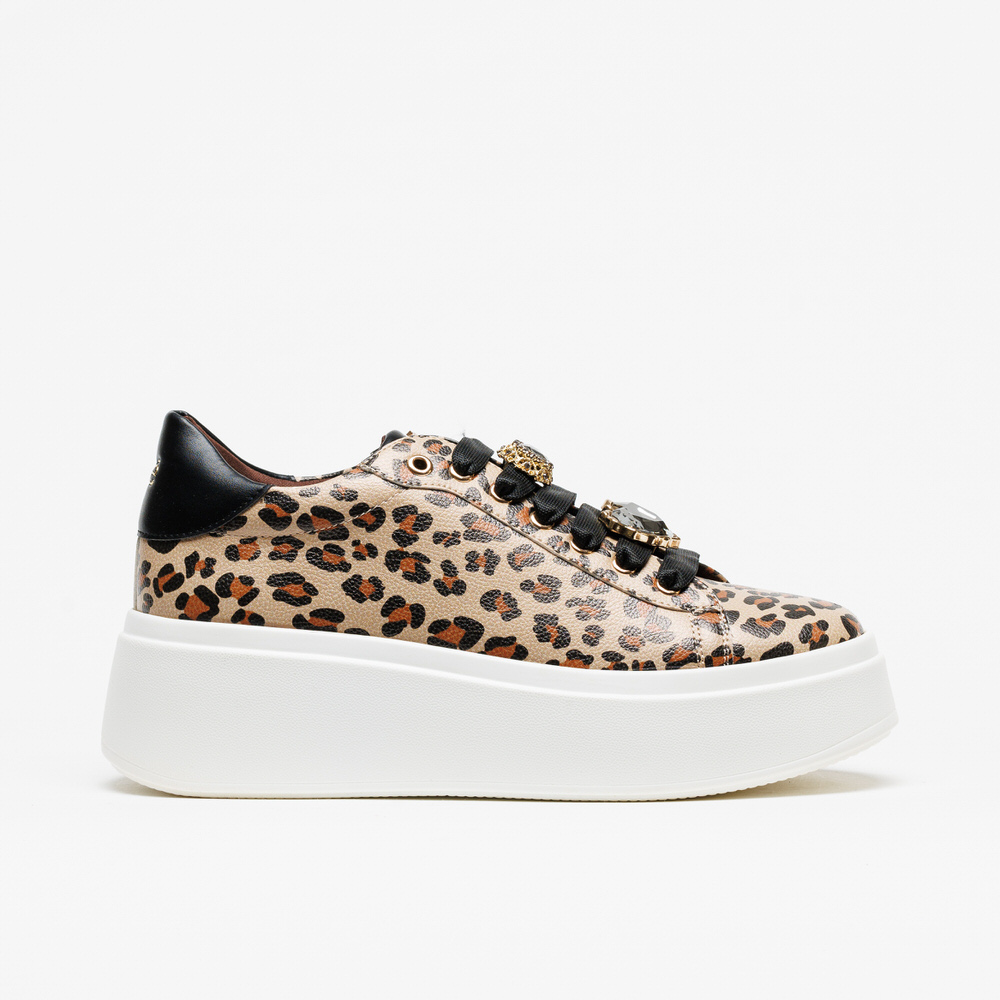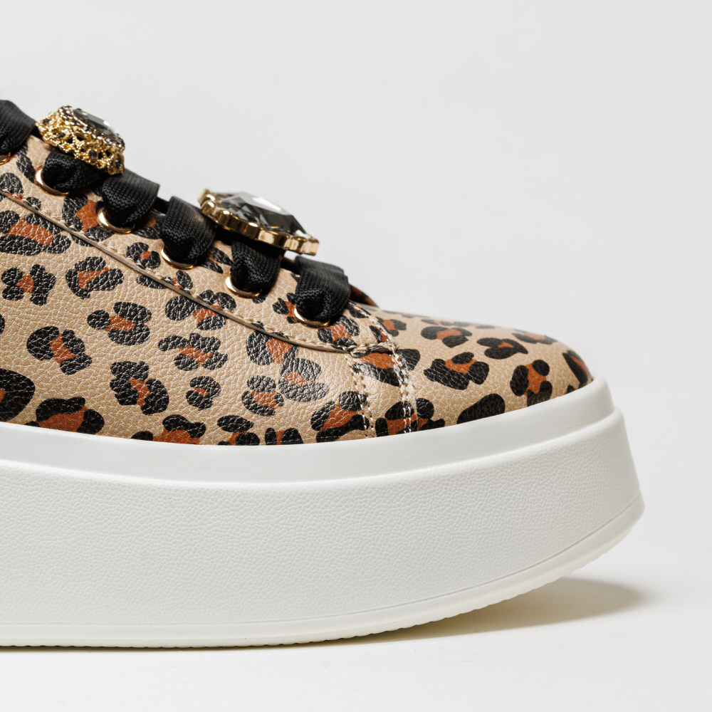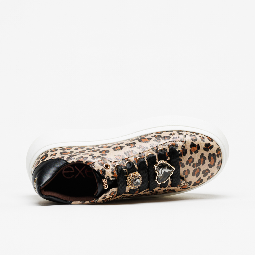 Sapatilhas Exé 66-52EX11 de padrão Leo, com atacadores em preto e aplicações douradas com pedraria, da Nova Coleção Outono-Inverno 2025/26.