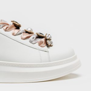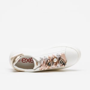 Sapatilhas Exé 66-52EX11 na combinação White/Gold, com atacadores em cetim rosa e aplicações decorativas estilo joia, da Nova Coleção Outono-Inverno 2025/26.