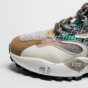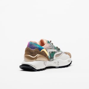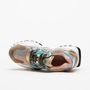 O jogo entre tecido respirável e apontamentos sintéticos confere leveza e textura, enquanto a sola em borracha — com 4 cm atrás e 3 cm à frente — oferece uma passada confortável e estável. Uma sapatilha que mistura brilho, modernidade e um toque de sofisticação descontraída.