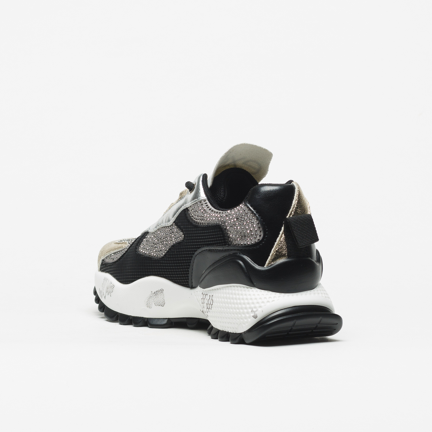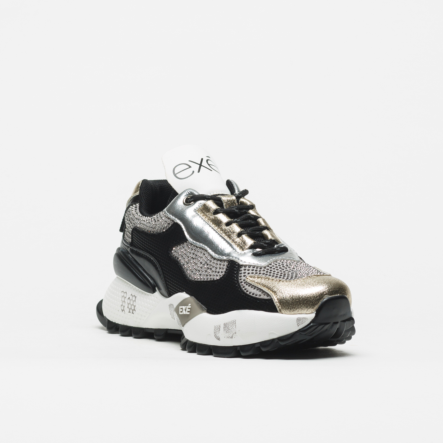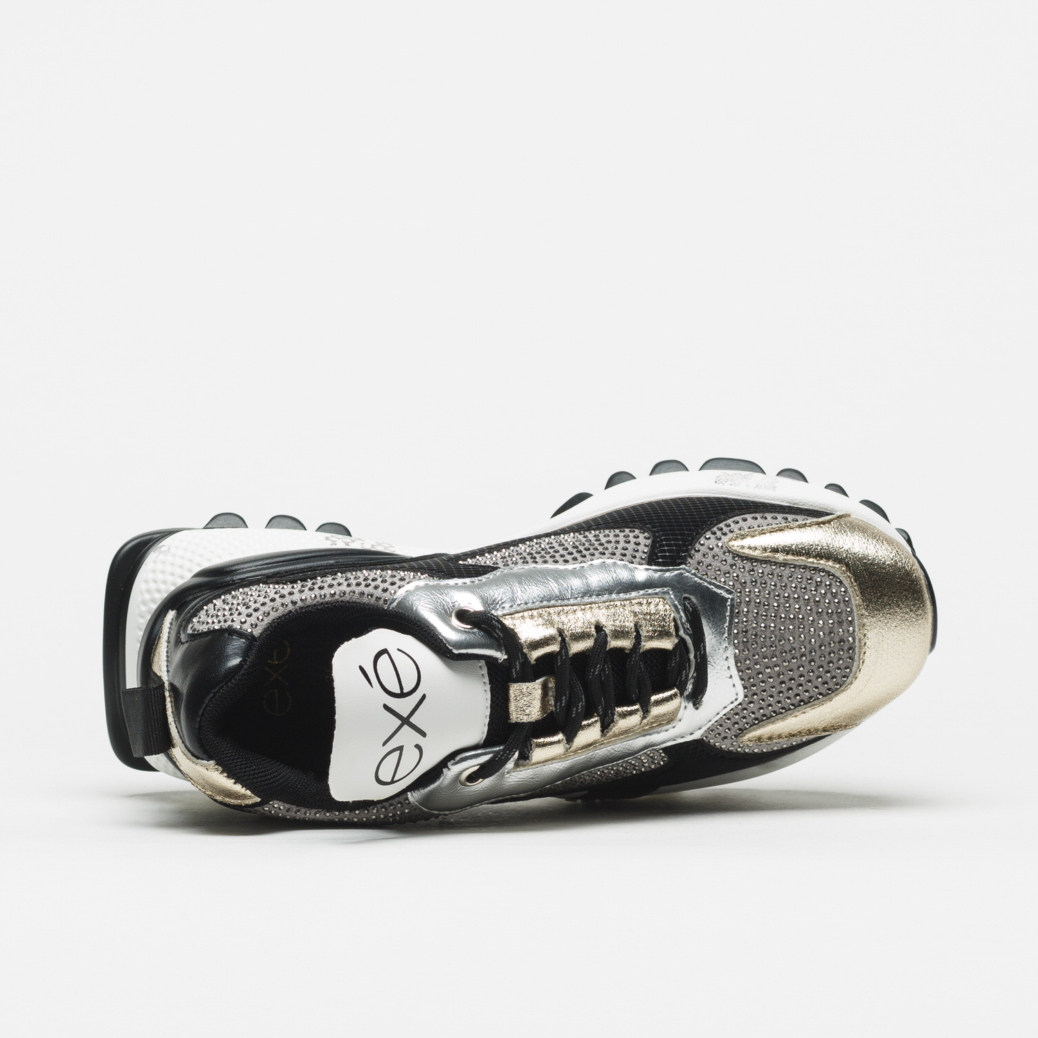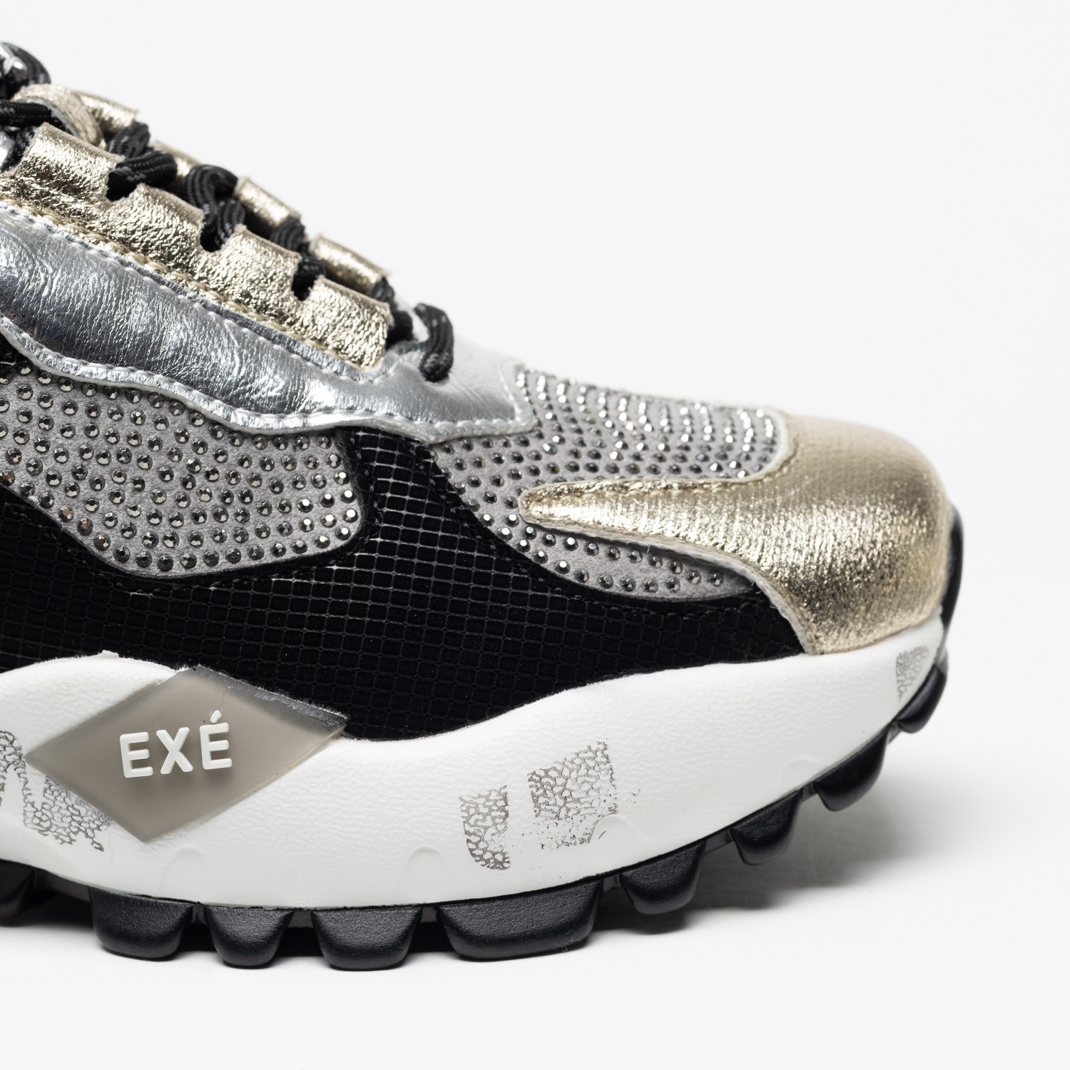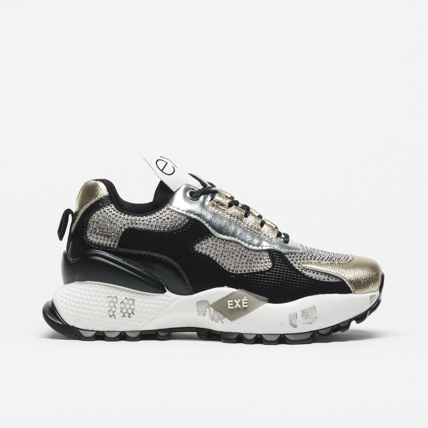 As sapatilhas Exé D190608-22A Black Gold destacam-se pelo contraste elegante entre o preto profundo e os apontamentos metalizados em dourado e prateado.