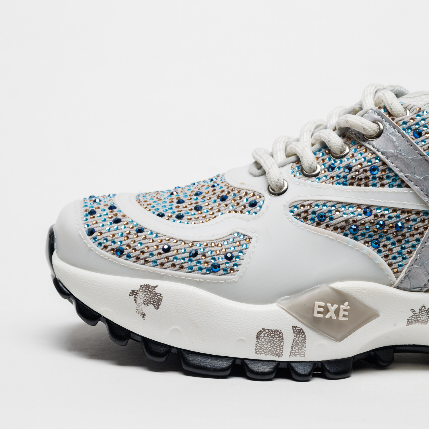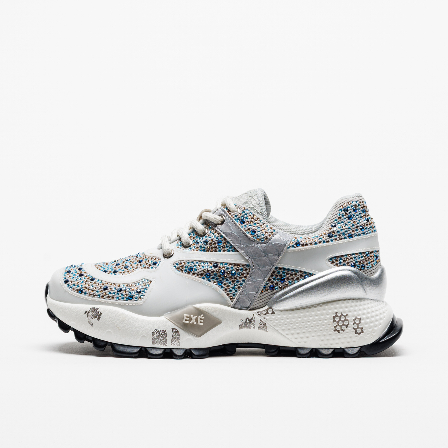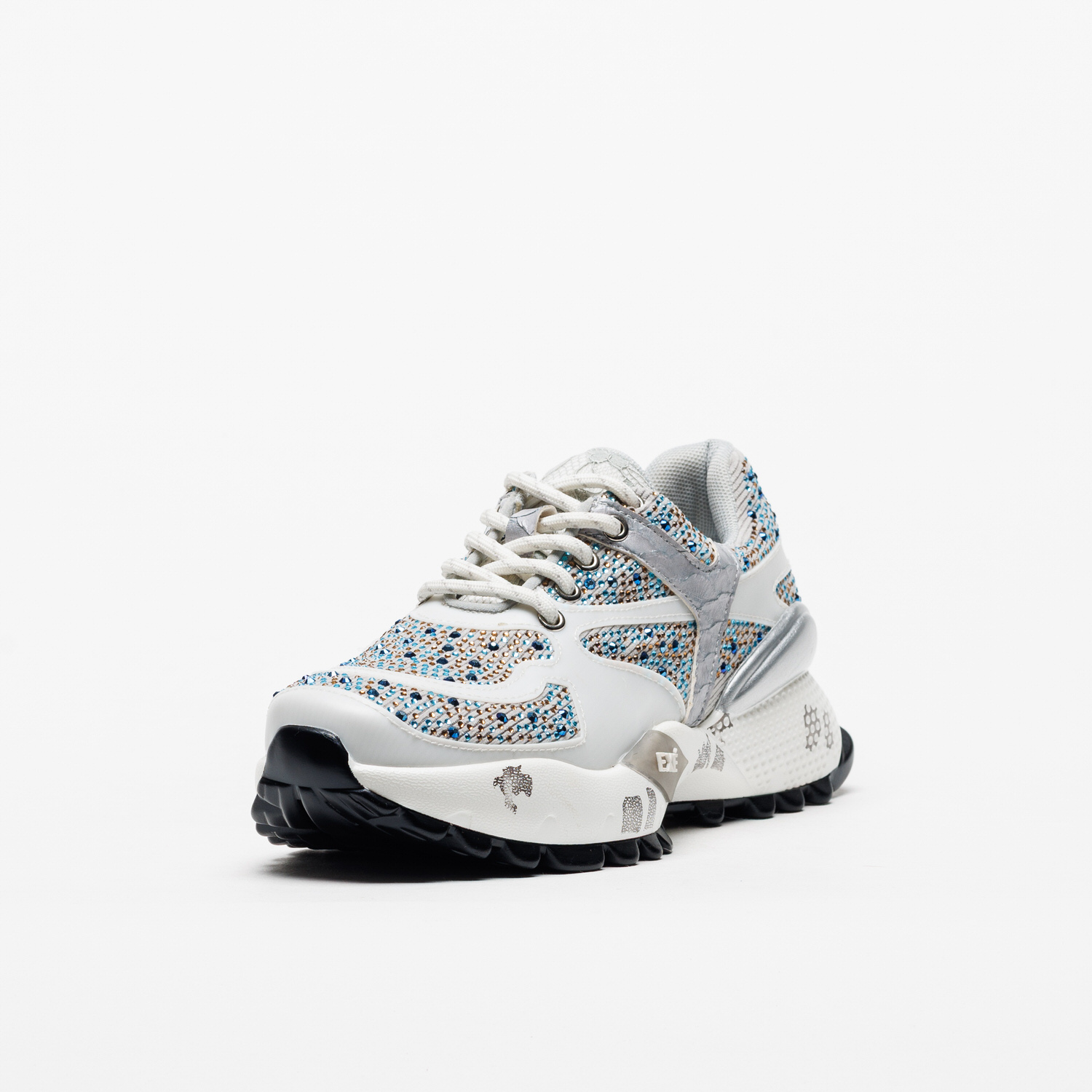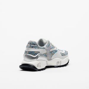 O jogo entre tecido respirável e apontamentos sintéticos confere leveza e textura, enquanto a sola em borracha — com 4 cm atrás e 3 cm à frente — oferece uma passada confortável e estável. Uma sapatilha que mistura brilho, modernidade e um toque de sofisticação descontraída.