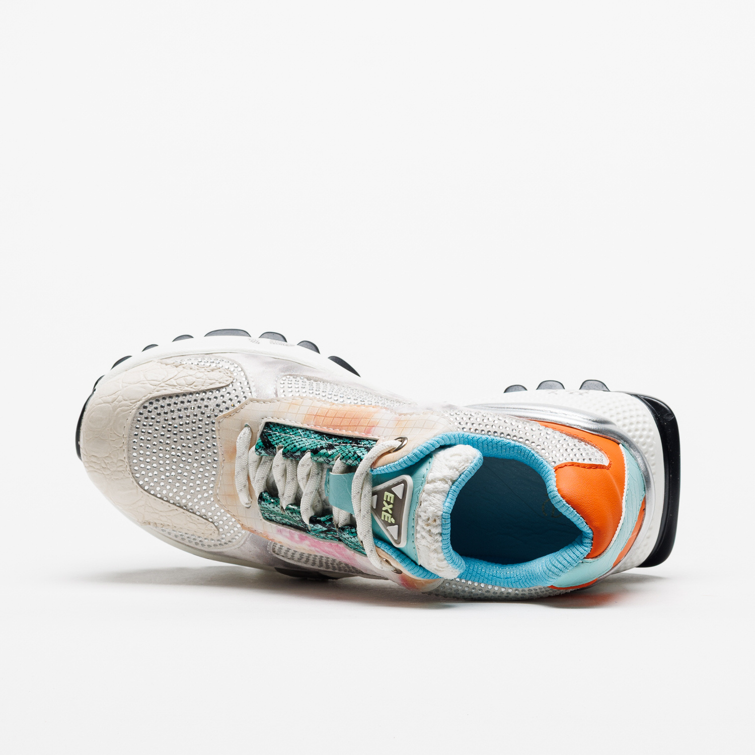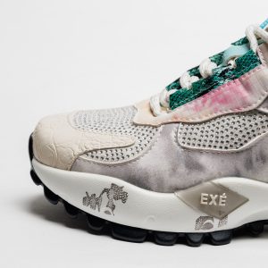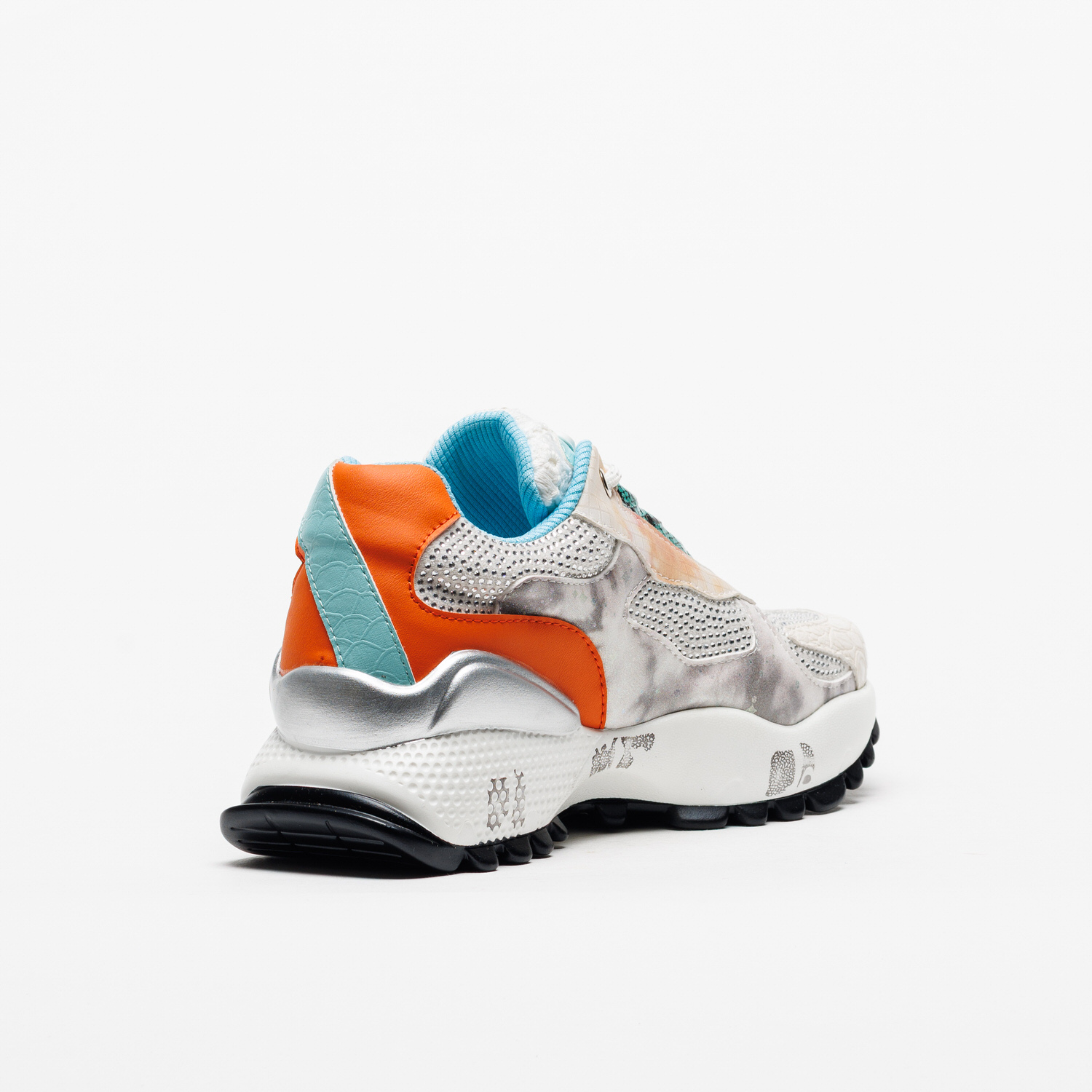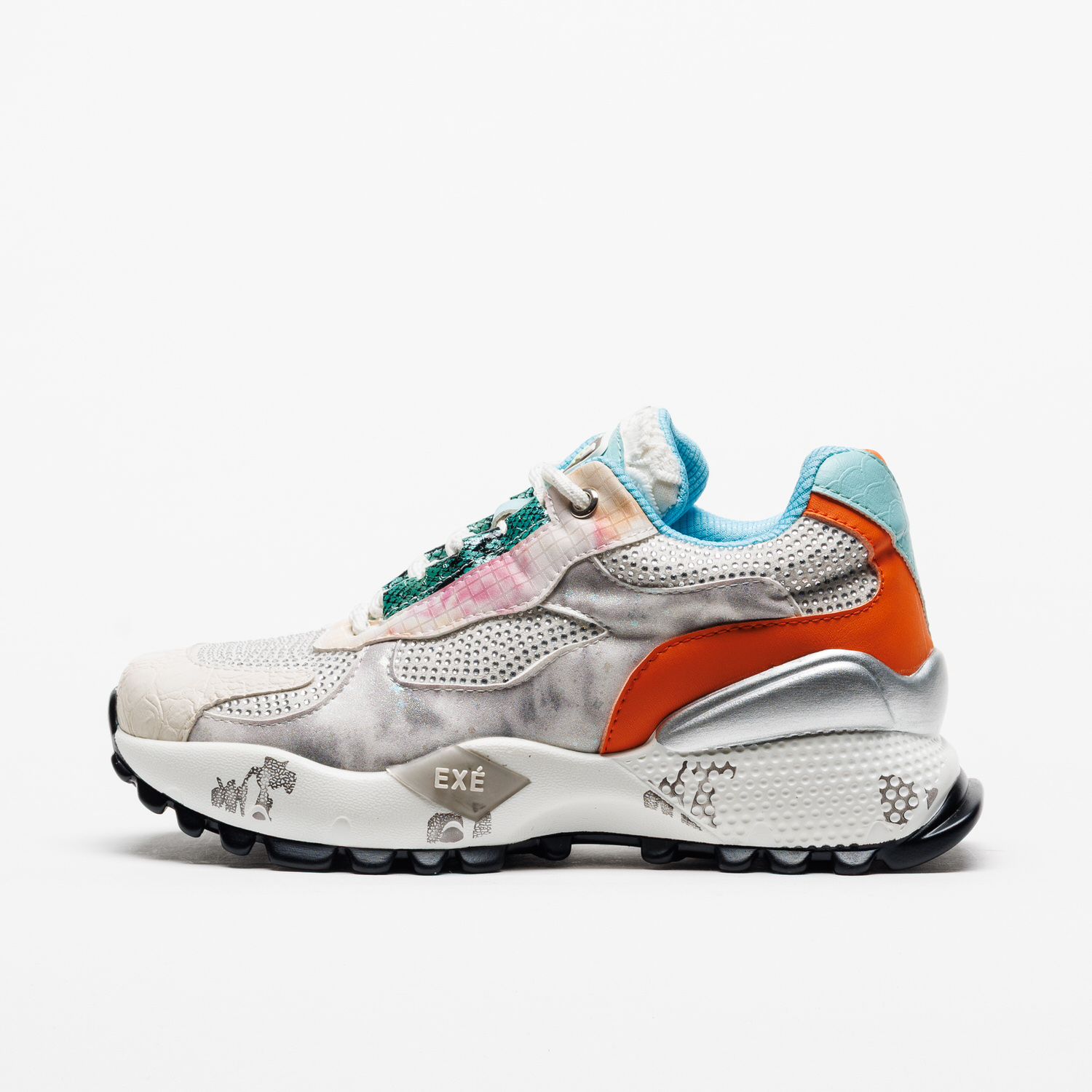 O jogo entre tecido respirável e apontamentos sintéticos confere leveza e textura, enquanto a sola em borracha — com 4 cm atrás e 3 cm à frente — oferece uma passada confortável e estável. Uma sapatilha que mistura brilho, modernidade e um toque de sofisticação descontraída.