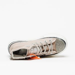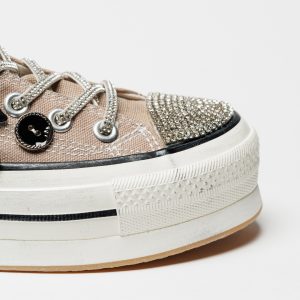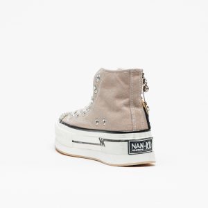 Sapatilhas Nan-Ku Couture EFA-03 em cor taupe — onde o estilo irreverente encontra o detalhe artesanal. Com um design high-top e plataforma, este modelo destaca-se pelos apliques únicos: correntes metálicas, tachas, patches com motivos divertidos e detalhes em padrão animal print.