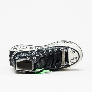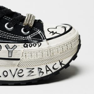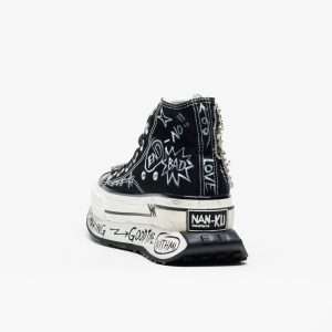 Sapatilhas Nan-Ku Couture EFC-03 em cor preta — criadas para quem adora estilo com personalidade. Com design high-top em lona, este modelo apresenta uma sola plataforma com lettering artístico pintado à mão, transmitindo mensagens positivas e cheias de atitude. Os apliques brilhantes em forma de letras e corações destacam-se na lateral, criando um visual glam rock irresistível.