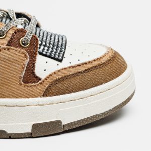 Sapatilhas Nan-Ku Couture EFE-03 em cor castanha — elegância e irreverência num só par. Com um design em pele e tecido, este modelo destaca-se pelas aplicações laterais em forma de estrela, repletas de brilhantes e correntes que conferem um efeito glamuroso e exclusivo.
