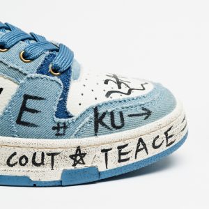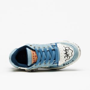Sapatilhas Nan-Ku Couture EFE-20 em cor Jeans Blue — criativas, divertidas e cheias de personalidade. Com um design em pele e ganga desfiada, estas sapatilhas destacam-se pelos grafismos pintados e aplicações decorativas em relevo, incluindo um coração brilhante lateral que lhes confere um toque único e irreverente.
