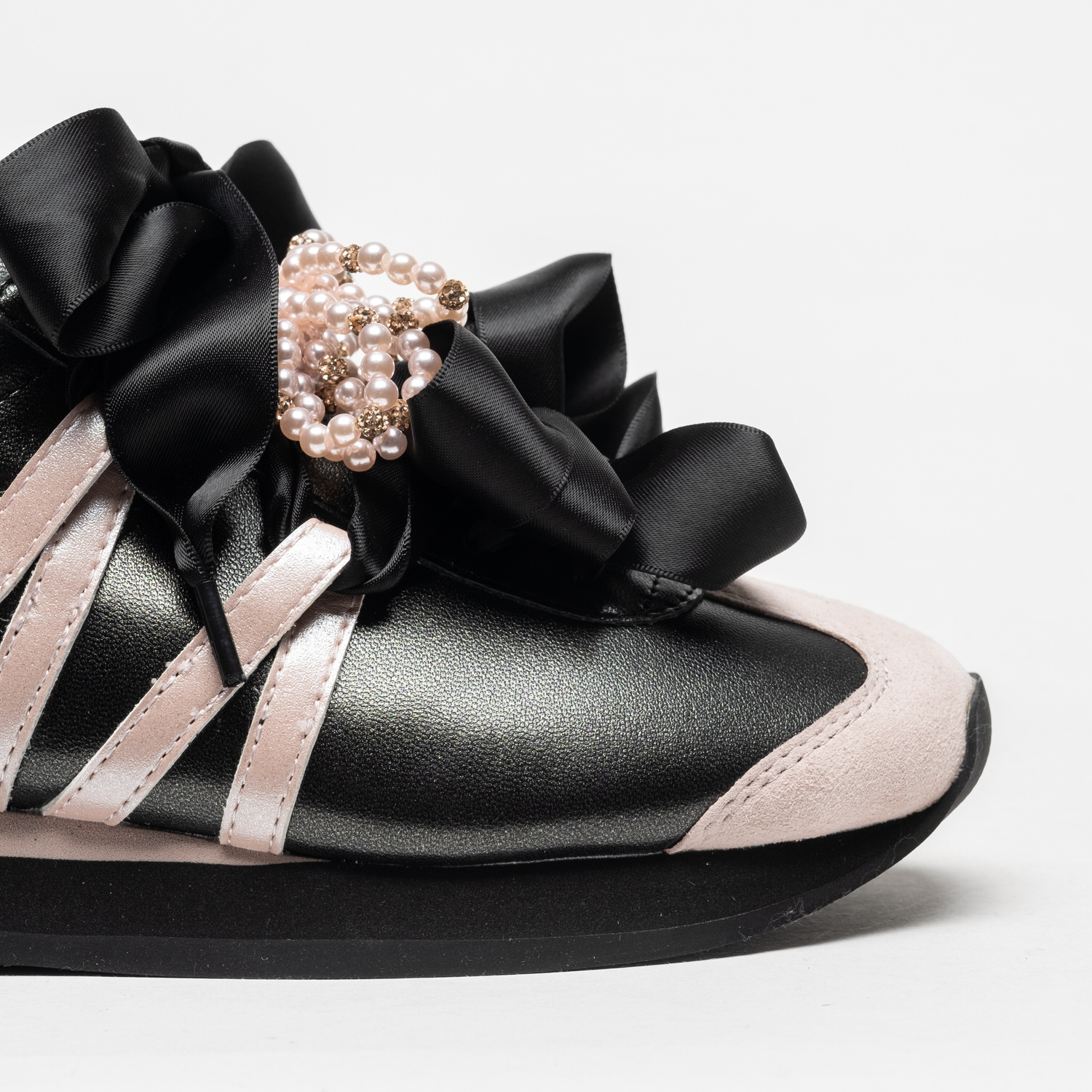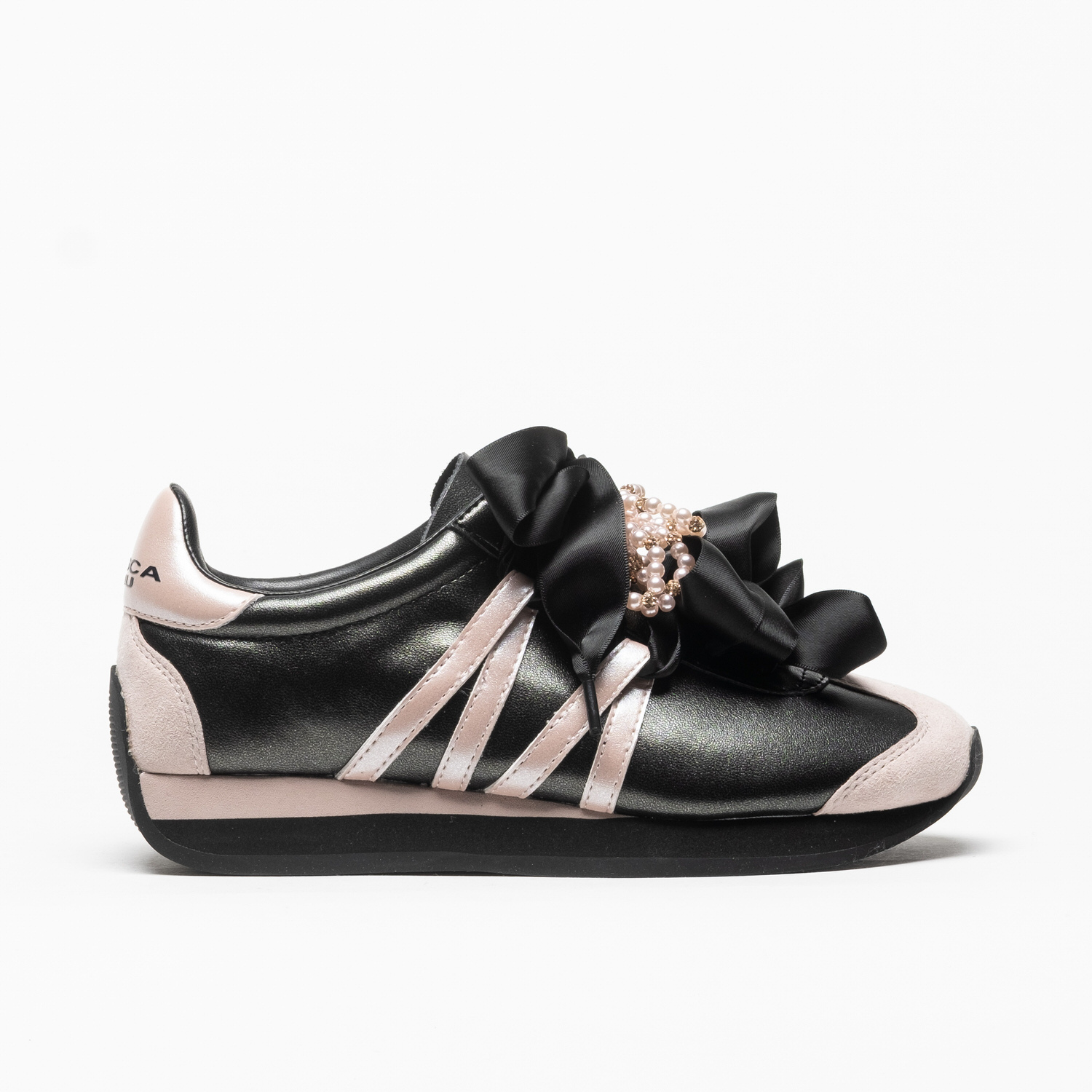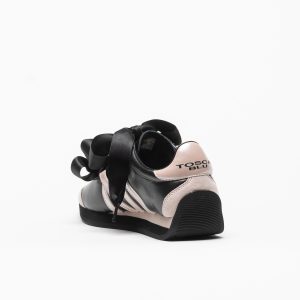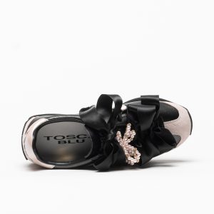 As sapatilhas Tosca Blu Malika em Nero Rosa distinguem-se pelo contraste elegante entre o preto profundo e os apontamentos em rosa suave, enriquecidos por um laço sofisticado com detalhe de pérolas.