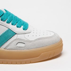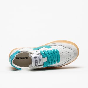 As sapatilhas Victoria 1257129 em Turquesa destacam-se pela base branca com apontamentos vibrantes em turquesa e sola em tom mel, criando um visual fresco e contemporâneo.